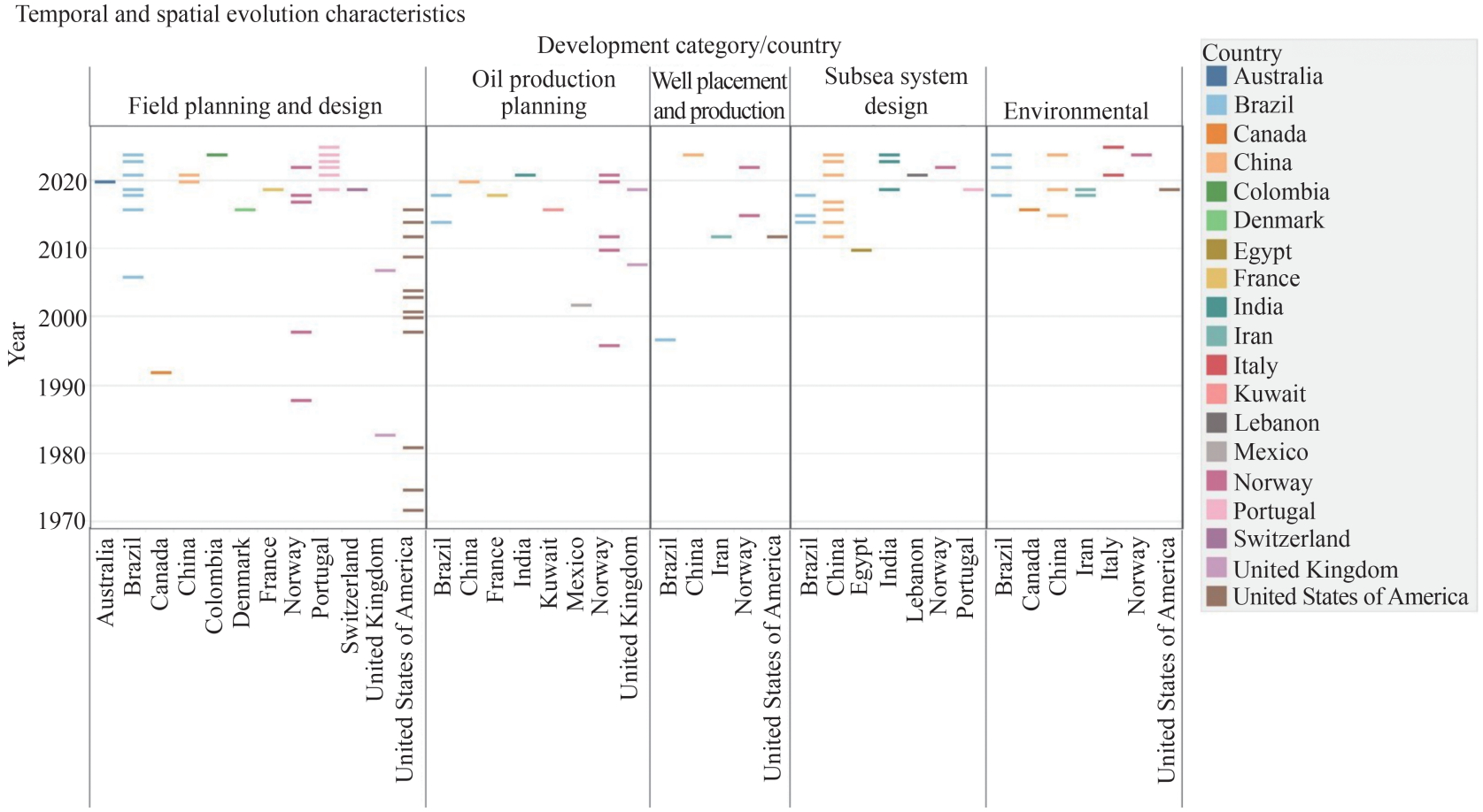 Brazil, China and Norway published articles in all development categories throughout the years (see Figure 6). The main research area of Brazil and the United States of America is field design and production planning. Norway focuses on two areas: field design and production planning, and oil production planning decisions. China's main research area is subsea system design. Furthermore, it is important to note that the United States of America was the first country to publish a scientific research article on offshore oilfield development, in 1972, followed by Norway in 1988, Brazil in 1997, and China in 2012.