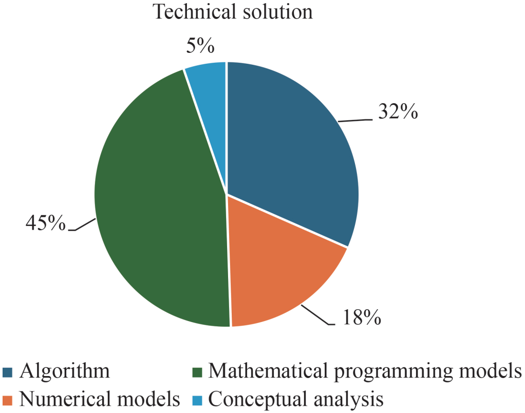 • The most commonly adopted technical solutions for the respective decisions are the mathematical programming models (45%), algorithms (32%), numerical models (18%) and conceptual analyses (5%).