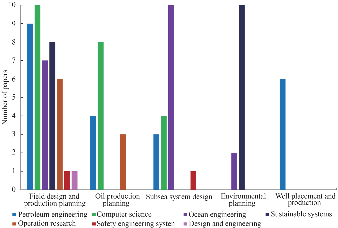 • The main decisions regarding offshore oilfield development planning, "field design and planning", "subsea system design", "oil production planning", "environmental planning", and "well placement and production" are covered in 43, 19, 15, 14 and 6 papers, respectively.