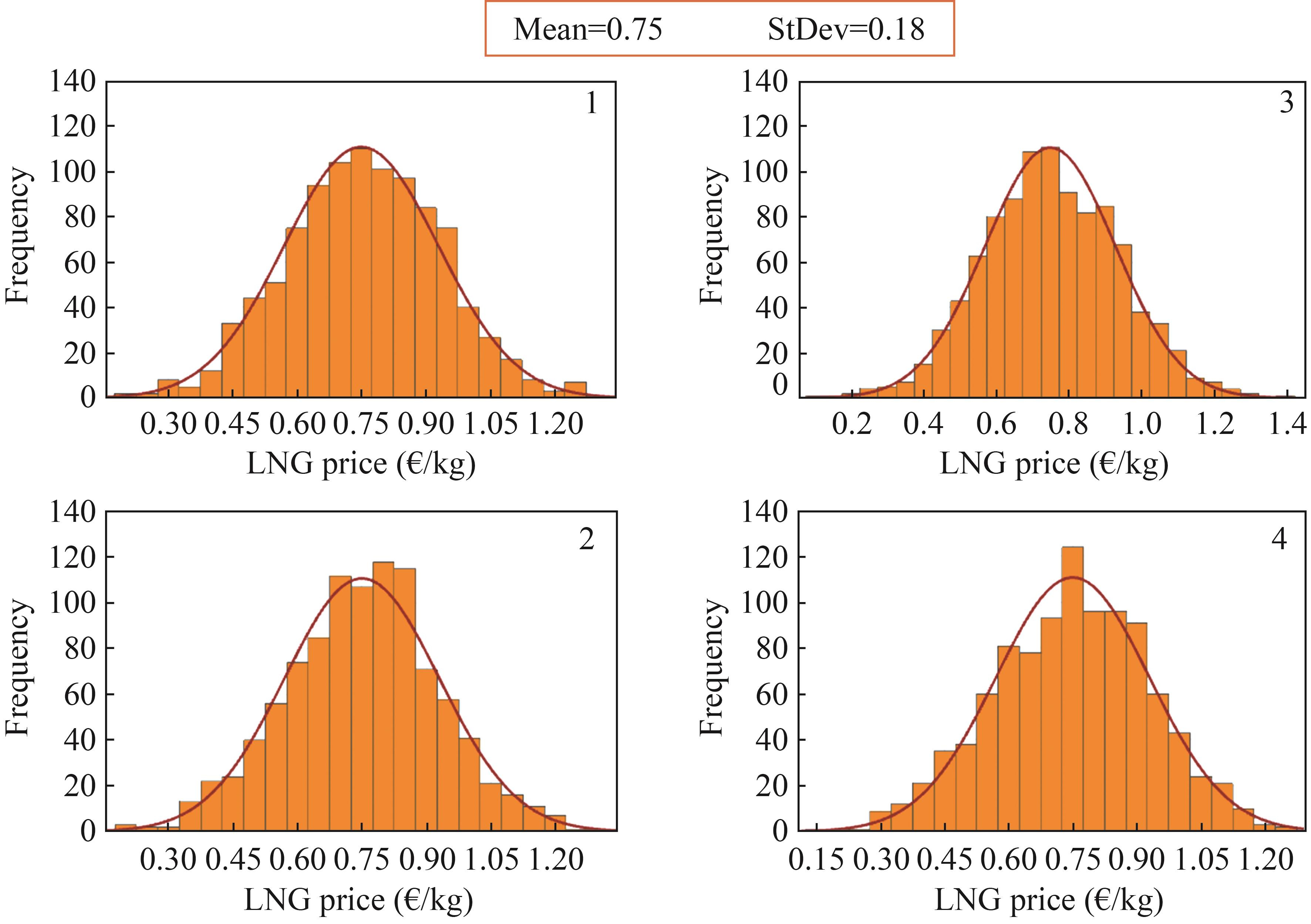 3) Monte Carlo simulations were employed to predict future fuel prices of LNG and diesel. Although some discrepancies are evident between the simulated price values and the normal distribution curve, the peak values cluster around the mean, with diesel prices reaching 1.55 €/kg and LNG prices reaching 0.75 €/kg. However, the StDev of the simulated values reflects the potential variability in future prices because of market, political, or other influences.