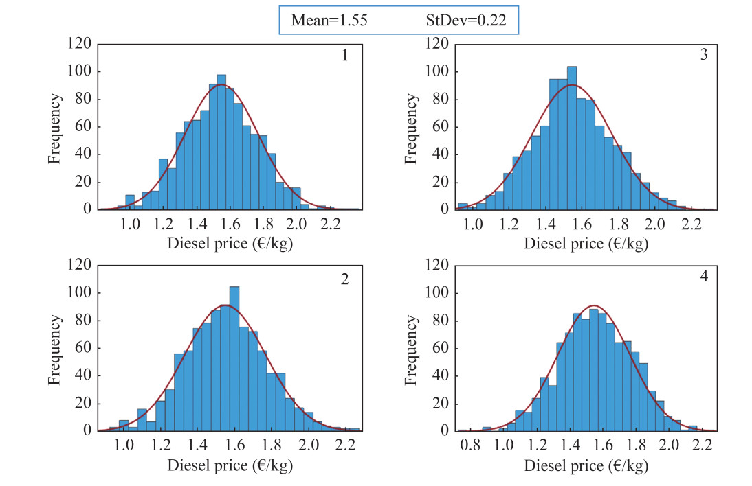 To ascertain whether the LNG power system is a more cost-effective option than a diesel power system, an LCCA is conducted. Within the analysis, the investment and maintenance costs are calculated based on the current prices obtained from the literature. The carbon tax is calculated following the most rigorous scenario, which predicts the CA value of 230 €/t CO2 by 2050 (NZES). The fuel cost is calculated with future fuel prices predicted by Monte Carlo simulations. The results of these simulations are presented in Figure 10 and 11, which illustrates the distributions of 1 000 simulated fuel prices per simulation of each fuel, maintaining consistent statistical properties (mean and StDev). The figures show the results of four simulations. The red line on each histogram denotes a normal distribution curve with the same mean and StDev overlaid for visual reference, indicating the close approximation of the simulated data to a normal distribution.