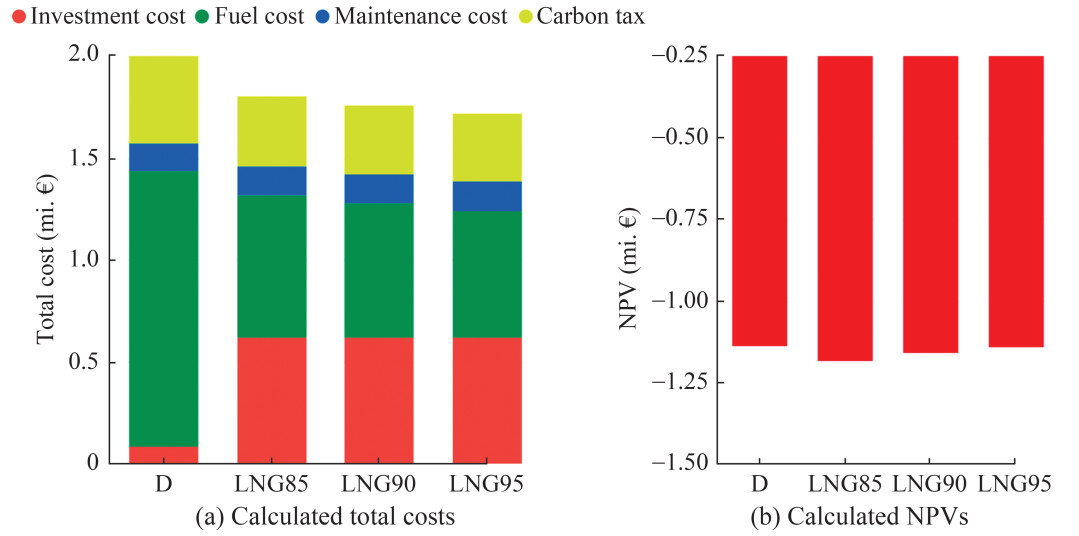 The LCCA comparison of diesel and LNG power systems showed that LNG power systems are less expensive than diesel power systems in terms of total costs. Specifically, the LNG95 power system configuration achieves the lowest costs, with a 13.8% reduction, whereas LNG85 and LNG90 power system configurations result in 9.5% and 11.8% lower total costs, respectively, which is primarily attributed to the higher costs of diesel fuel and carbon tax. However, the NPV calculation yields a different result. The NPV of the diesel power system is 1.9% and 3.7% lower than that of the LNG power system in the case of LNG90 and LNG85, respectively. By contrast, the NPV of LNG95 is nearly identical to that of the diesel power system, with a difference of only 0.2%. This discrepancy is largely attributed to the higher initial investment cost of LNG-powered ships. In contrast to the costs of diesel fuel and carbon tax, which are discounted over time, the substantial upfront investment cost of LNG infrastructure on board does not benefit from discounting, leading to a higher NPV for LNG systems.