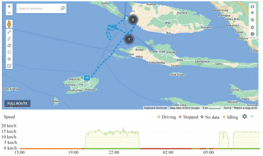 B rating = 480 kW at 1 350 r/minEngine International Air Pollution Prevention (EIAPP) IMO Ⅱ The operational profile of a typical purse seiner encompasses a series of activities, including cruising to the open sea, searching for fish, encircling the fish (setting the net), hauling, loading, and cruising back to port. These activities are subject to significant daily fluctuations, with alterations in fishing locations, weather conditions, and operational strategies resulting in notable fluctuations in FC (Perčić et al., 2023b). To accurately determine the actual FC and associated CF, the specific operating regime of a vessel needs to be investigated (Basurko et al., 2016). Several Croatian fishing vessels, including the one observed, are equipped with FC monitoring systems, global positioning system (GPS) tracking, and accessory switches that indicate engine activation or deactivation. These systems are linked to the MAPON software (MAPON, 2024), which provides real-time data on the activities, routes, specific locations, fuel use, and speed of the vessel (Koričan et al., 2023) (Figure 2).