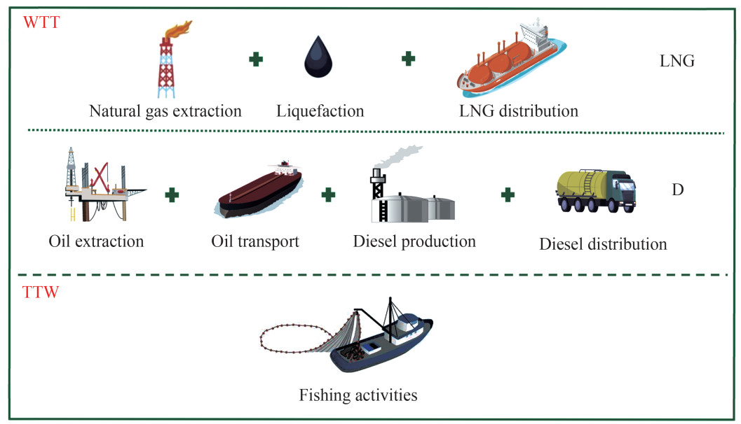 The assessment considers emissions from the well-to-tank (WTT) and tank-to-wake (TTW) phases of the life cycle of the ship power system. The WTT phase refers to the emissions released throughout the fuel cycle, including the extraction of raw materials, transportation to the production facility, fuel production, and distribution to the tank in ports. By contrast, TTW emissions are released during the ship operation, i.e., fishing activities. The processes included in the LCA of a diesel-powered ship (which serves as a baseline scenario) and an LNG-powered ship are presented in Figure 4. Meanwhile, the distances for transportation processes are obtained from a study conducted by Perčić et al. (2023b).