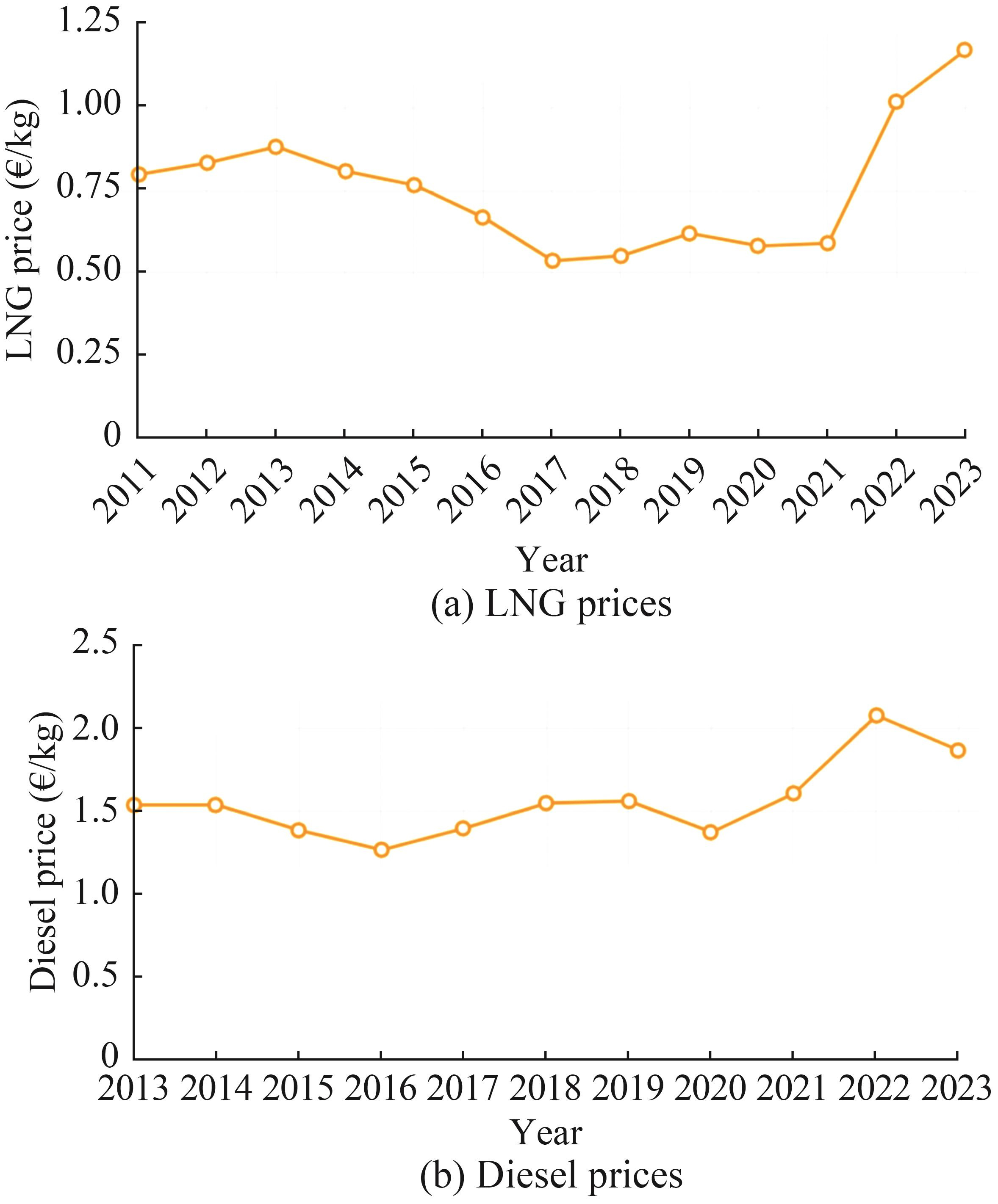 This study investigates the prediction of future LNG and diesel fuel prices using the Monte Carlo simulations. As the simulation results depend on the quality of the inputs, comprehensive historical data on diesel and LNG prices need to be provided, as illustrated in Figure 5, which shows the average fuel prices over time.
