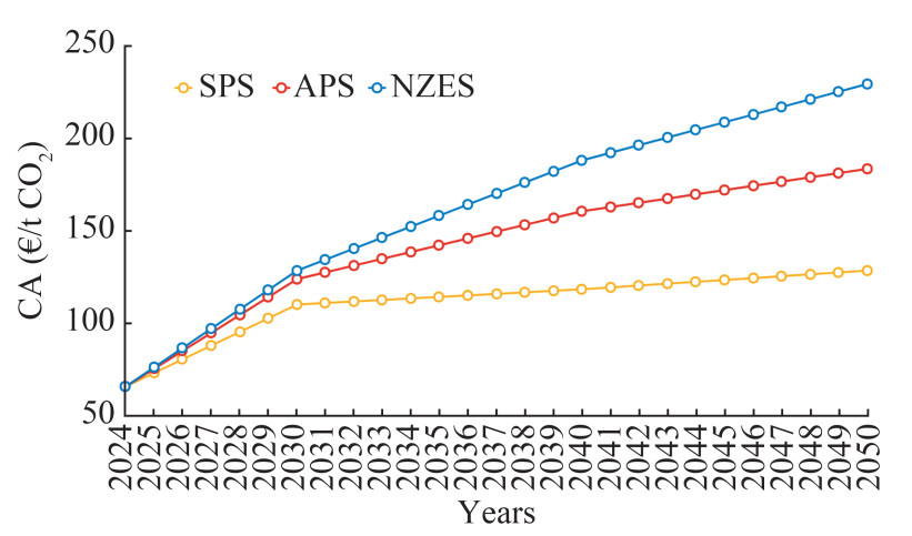 From January 2024, the EU's Emissions Trading System (EU ETS) has been expanded to include CO2 emissions from large ships (5 000 GT and above) entering EU ports, irrespective of their flag. This study investigates the possibility of extending the EU ETS to other ship types, such as fishing vessels. To ensure a seamless transition to the additional costs, shipowners are required to pay for their reported emissions gradually. The initial payment will be 40% due in 2025, followed by 70% in 2026, and the final 100% in 2027 (European Commission, 2024). The current market price of CA (in December 2024) is approximately 66 €/t of CO2 (Trading Economics, 2024b). However, the International Energy Agency (IEA) forecasts that this value could increase to 230 €/t of CO2 by 2050. In their World Energy Outlook 2023 (IEA, 2023), three carbon pricing scenarios are presented, each with projected CA (€/t CO2) for 2030, 2040, and 2050. These carbon pricing scenarios are the stated policies scenario (SPS), the announced pledges scenario (APS), and the net zero emissions by 2050 scenario (NZES). The SPS is based on the assumption that current policies and the EU's existing policy intentions and targets will remain in place. The APS includes advanced economies with net zero emissions pledges, encompassing all Organisation for Economic Co-operation Development countries, except for Mexico, whereas the NZES includes all regions with net zero emissions pledges by 2050. Figure 6 illustrates these scenarios, with values for other years obtained through interpolation.