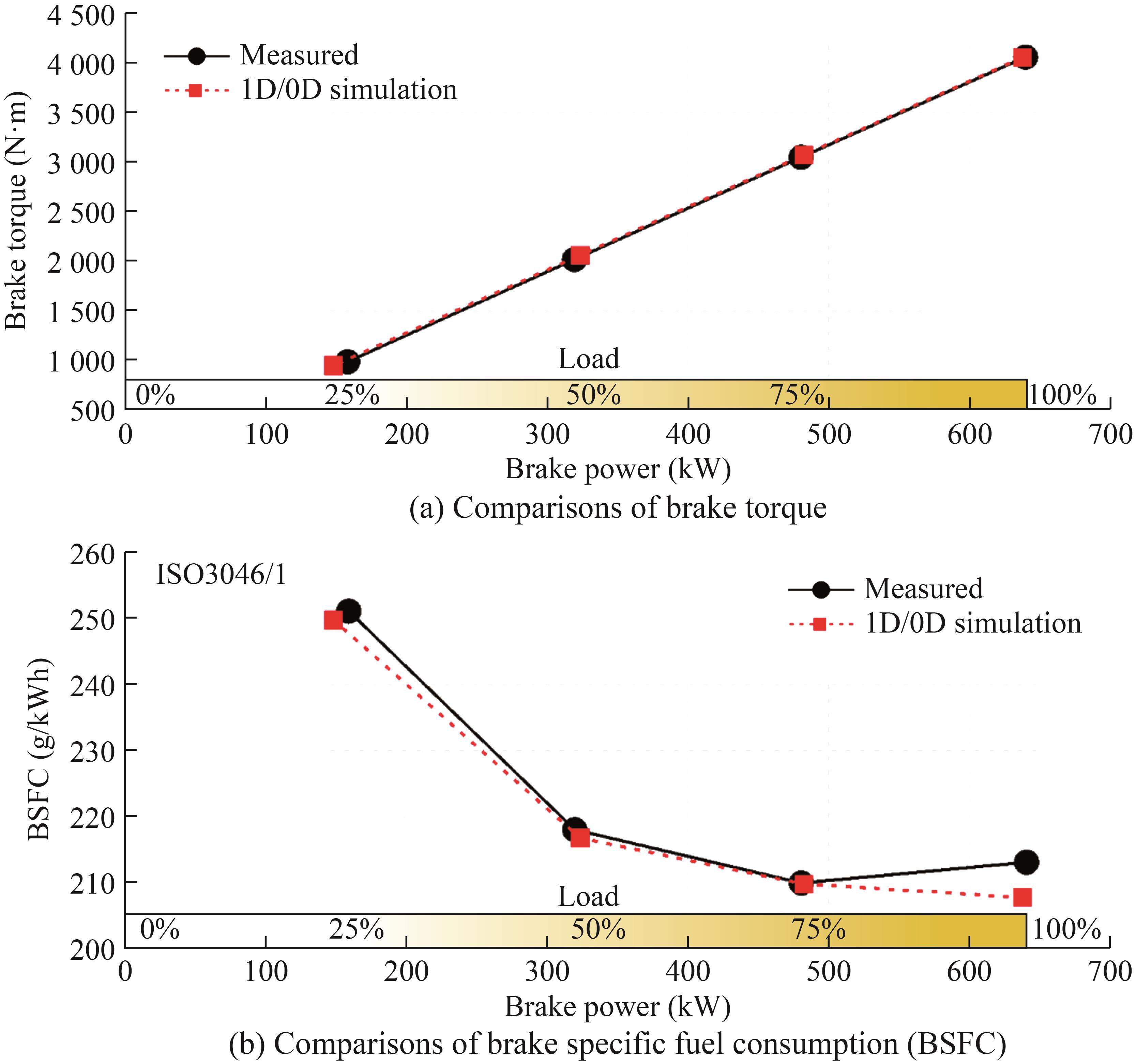 The 1D/0D simulation model of the diesel engine of a fishing vessel was validated under steady operating conditions defined by the engine manufacturer. Four engine operating points representing load sweep (i.e., 25%, 50%, 75%, and 100%) at a constant engine speed of 1 500 r/min were considered, and the engine performance and FC were compared with the reference data.