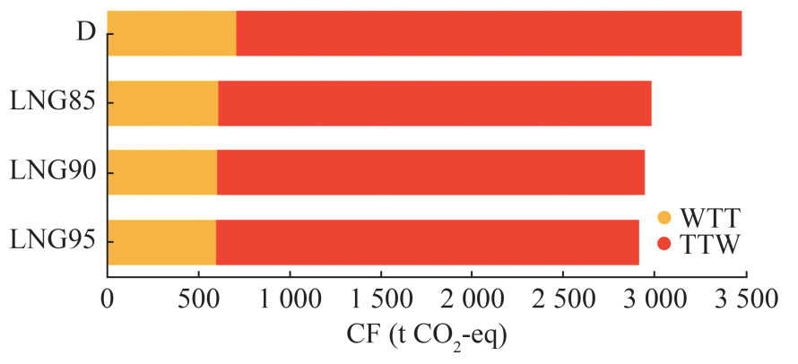 $$ E_j=E_{\mathrm{WTT}, j}+E_{\mathrm{TTW}, j} $$ (7) The global warming potential (GWP, CO2-eq) is used to assess the contribution of GHGs to global warming. GWP measures the amount of energy absorbed by a ton of a specific gas over a given time compared with the emission of a ton of CO2. Using the CO2-eq factors over 100 years (CO2 : 1; CH4 : 36), the CF can be calculated as follows (Perčić et al., 2022):