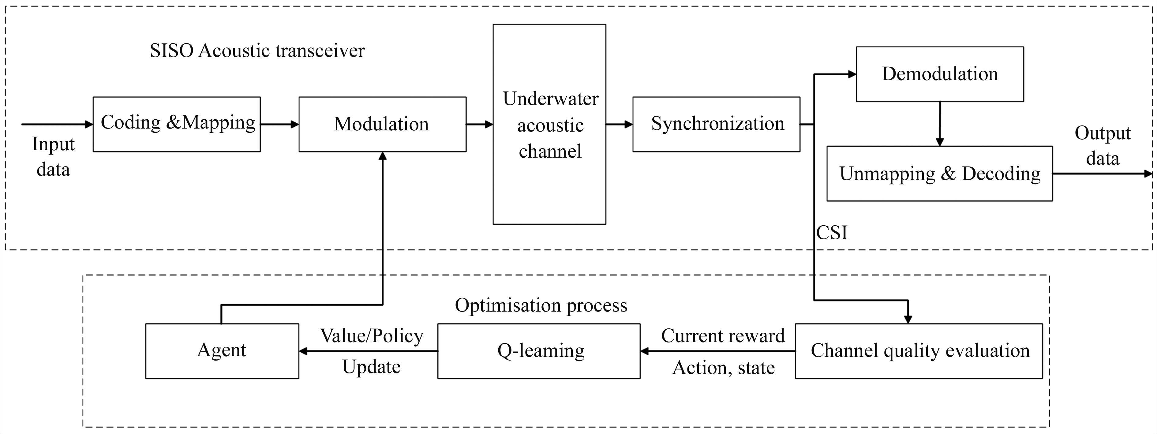 However, most previous research has relied on numerical simulations, revealing a considerable lack of field investigations under practical UWA channel conditions to evaluate the performance enhancements of reinforcement learning-based modulation optimization. Huang and Diamant (2020) used realistic experimental data to validate a throughput classification approach. However, due to the drifting of the two receivers and the time-varying channel, the channel state (SNR) varied across different modulation schemes. Sweta et al. (2024) proposed a reinforcement learning-based automated modulation switching algorithm designed to enhance data transmission efficiency and communication quality. The study presents a cost-effective acoustic modem design using commercially available components, implemented on a Raspberry Pi, enabling full-duplex underwater communication. Although a number of RL models have been successfully applied to adaptive communication, validation experiments based on real marine environment data are limited. A field experiment in a representative shallow water channel is conducted to assess the practical effectiveness of RL in shallow sea underwater acoustic communication. The evaluation involved three modulation modes, namely, OFDM, MFSK, and DSSS; it provided a performance analysis and comparison of Q-learning-driven adaptive modulation schemes using field verification data.