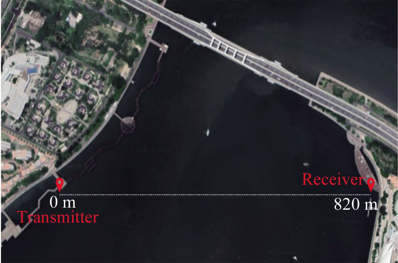 The field experiment was conducted in Wuyuan Bay, Xiamen, China. It is a semienclosed bay with an average depth of approximately 10 m. The signal was transmitted from a transceiver fixed at a depth of 5 m, and the transmitted signal was received and collected by a receiver suspended at the same depth, with a sampling rate of 75 kHz. The frequency bandwidth of the transducers was 13–18 kHz. The distance between the two terminals was 820 m, as shown in Figure 2. Remarkable impulse noise can be observed in the collected signal waveform due to frequent boat traffic passing by the experimental location, as illustrated in Figure 3.