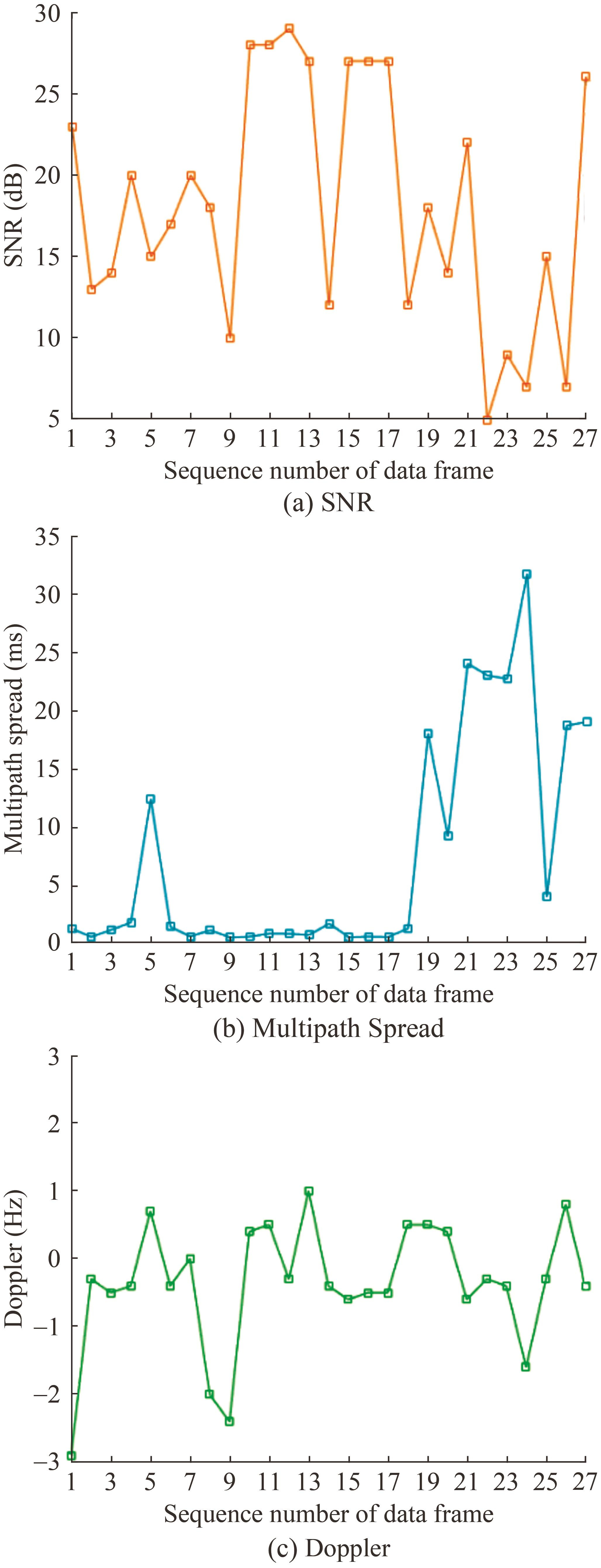 The SNR, multipath spread, and Doppler shift (Wan et al., 2012) measured during the experiment are provided in Figures 6(a), (b), and (c) respectively. On this basis, the CSI of the collected information data was calculated. As shown in Figure 6(a), the SNR of all packets exhibits a descending trend with considerable fluctuations, ranging from 5 to 29 dB. Meanwhile, the multipath spread is generally higher after the start of the 19th sequence, as revealed in Figure 6(b). The behavior of SNR and the multipath spread indicate that the channel quality deteriorated in the second half of the experiment duration. The reason for this finding is that the depth of Wuyuan Bay decreased due to the tide. Notably, compared with SNR and multipath spread, the Doppler value appeared more stochastic in Figure 6(c). Given that the transducers at both sides were fixed to wooden stacks with ropes, a smaller relative motion was observed, resulting in overall low Doppler values for all data packets.