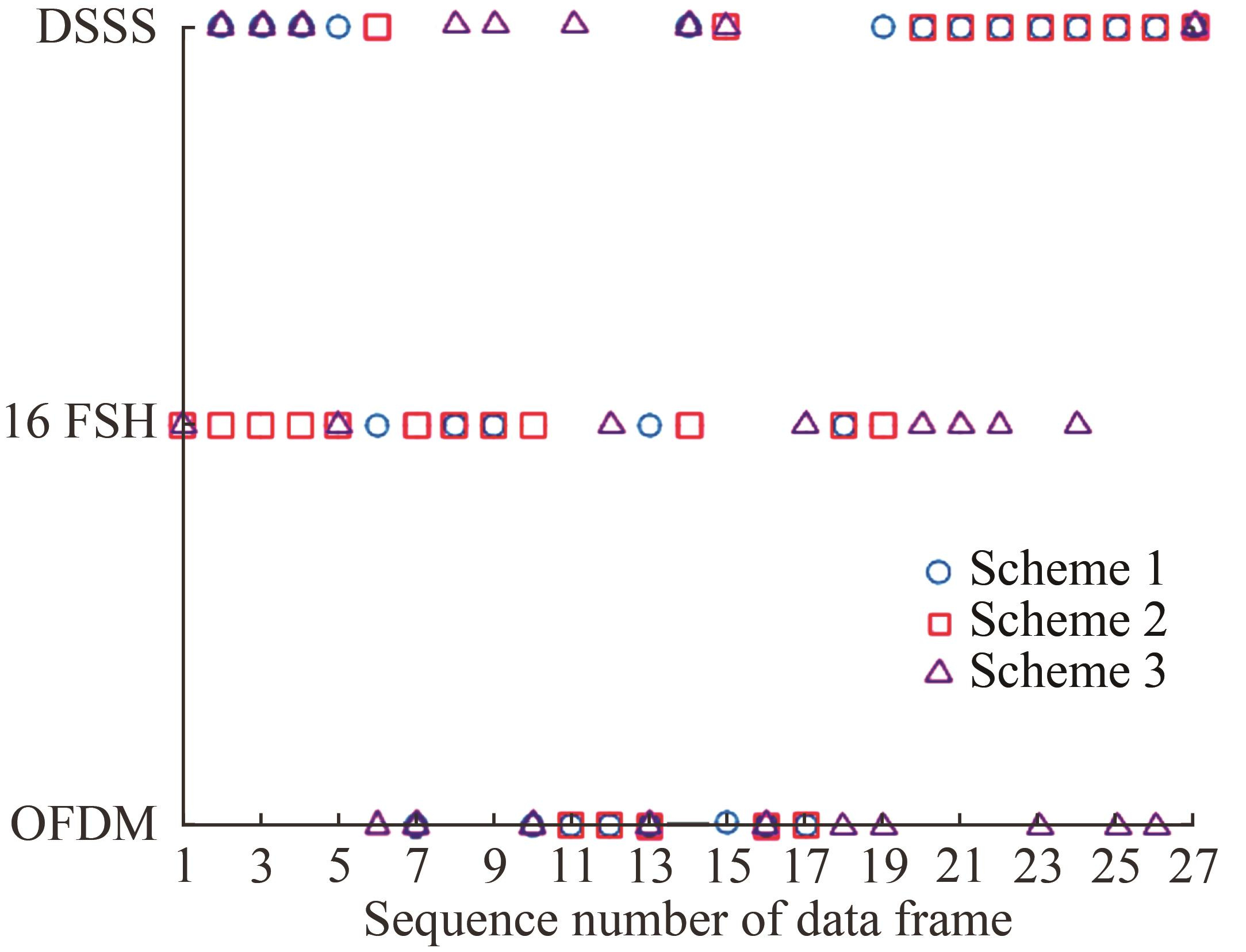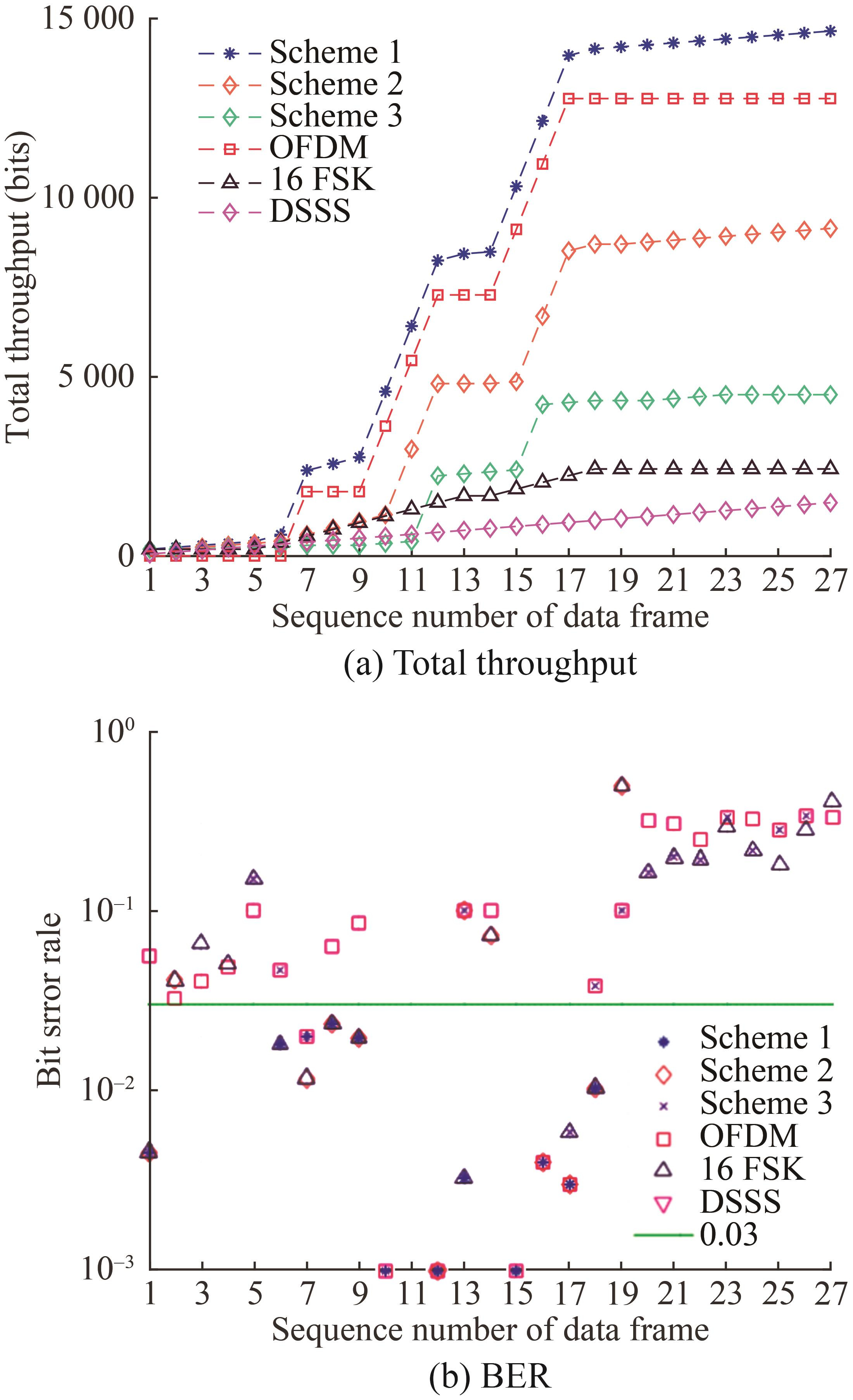 The performance of different single modulation modes, as well as adaptive modulation strategies, is shown in Figures 7(a) and 7(b), respectively. The figures illustrate that Scheme 1 achieves the highest throughput Fall, corresponding to a total throughput of 14 645.3 bits, which is 14.8% higher than that of the second highest throughput achieved using the single OFDM mode at 12 762.1 bits. A sudden increase in throughput was observed at certain sequences because the mode has been transformed into the OFDM, whose bit rate is much higher than the other. The total throughput of Schemes 2 and 3 is 9 139.4 and 8 332.3 bits, respectively. The 16 FSK and DSSS modes produce the lowest throughput of 2 425.9 and 1 485 bits, respectively.