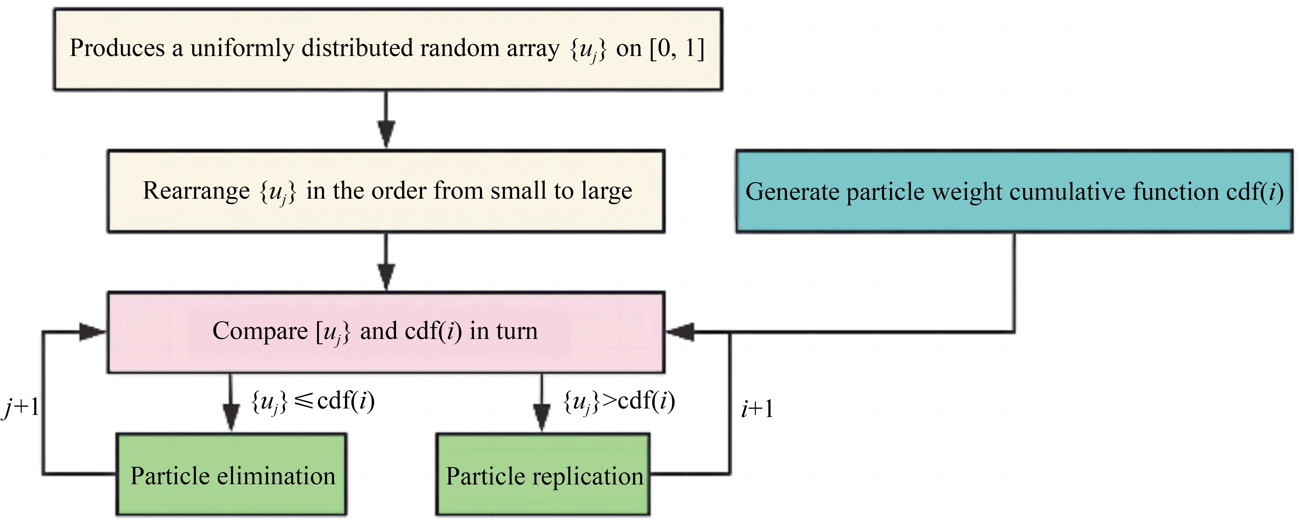 4) Resampling according to $\bar{\omega}^{\prime}(i) $: The particle set is replicated and eliminated by $\hat{\boldsymbol{X}}_k^{(i)} $, and the covariance matrix $\boldsymbol{P}_k^{(i)} $ is updated. Common resampling methods include Random Resample, Multinomial Resample, System Resample, and Residual Resample (Bolić et al., 2004; Kuptametee and Aunsri, 2022). There is no obvious performance difference between the above resampling methods. Figure 1 describes the algorithm flow of the Random Resample algorithm used in this paper.