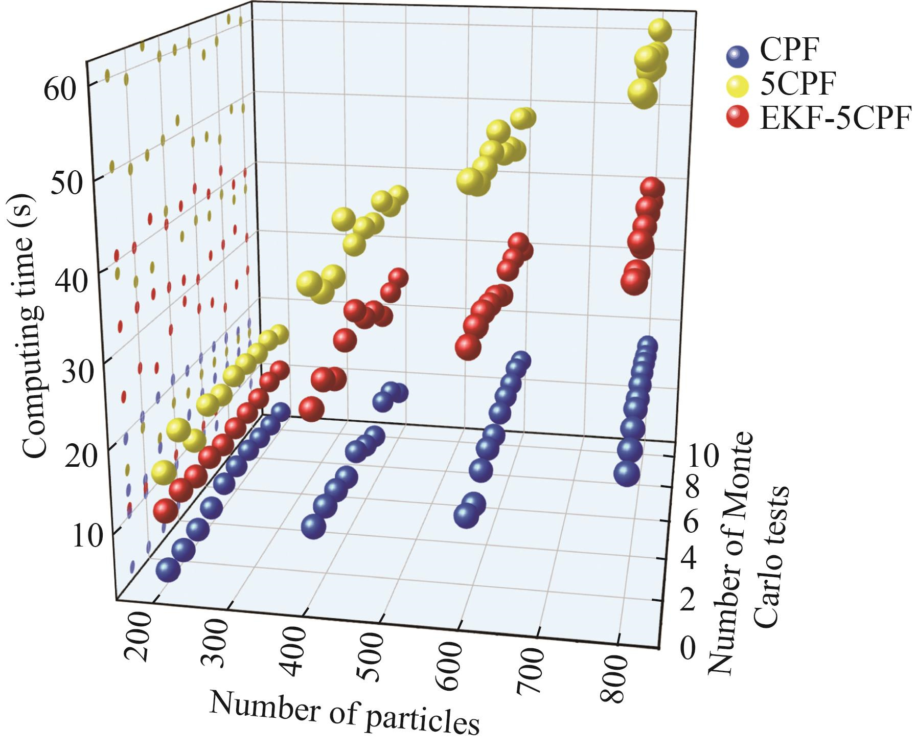 b) As the quantity of particles grows, the computational burden of the 5CPF algorithm rises considerably, resulting in operation times that are considerably longer than those of the CPF algorithm. The EKF-5CPF algorithm effectively mitigates the computational complexity associated with the 5CPF algorithm, thereby enhancing its real-time performance.