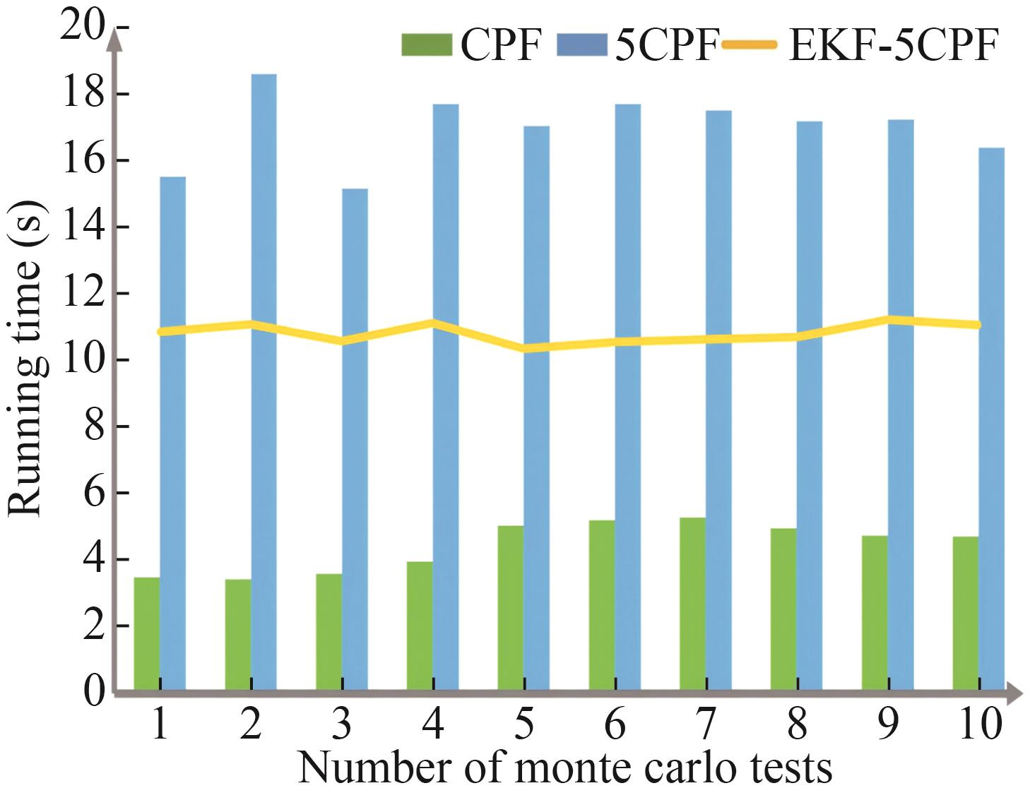 For a uniform linear moving target, the 5CPF algorithm selects 33 cubature points near each particle, whereas the CPF algorithm only selects eight cubature points. Therefore, as the number of particles increases, the calculation amounts of EKF-5CPF and 5CPF algorithms increase exponentially, and the real-time performance of these algorithms declines (Figure 10). When N=200 and t=300 s, the calculation amount and calculation time are much higher than those of the CPF algorithm. The EKF-5CPF algorithm uses the EKF algorithm to replace the 5CPF algorithm when the time of each particle is updated, which effectively reduces the calculation amount of the 5CPF algorithm. Through ten Monte Carlo experiments, CPF’s running time is approximately 3–5 s, that of 5CPF is about 15–18 s, surpassing that of CPF significantly, and that of EKF-5CPF is about 11 s (Figure 11). Although the running time of 5CPF is still higher than that of CPF, it reduces the calculation time of 5CPF to a certain extent and enhances the algorithm’s real-time capability.