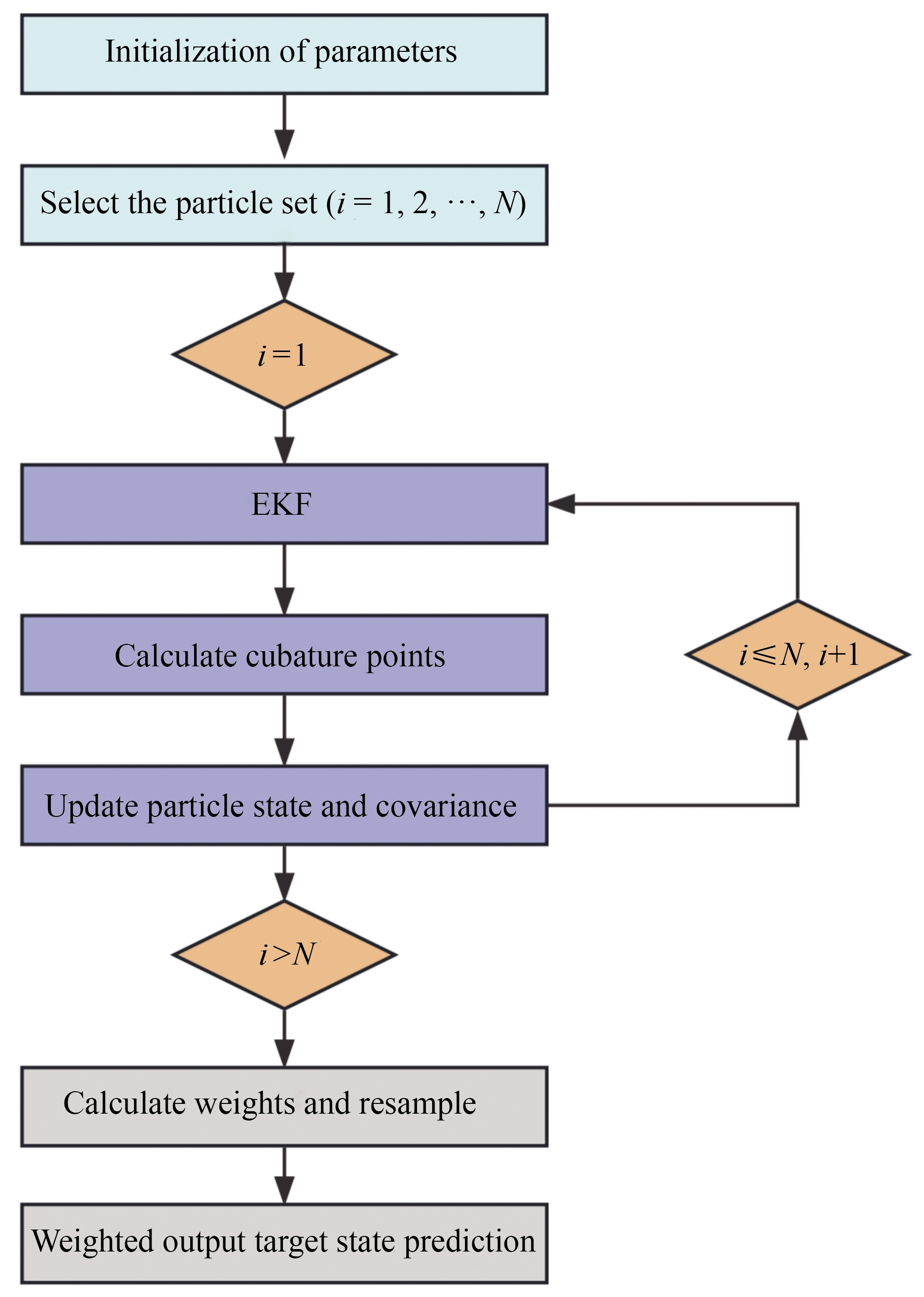The 5CPF algorithm combines the latest measurement information of observation stations. During the particle sampling stage, we employ the 5CKF algorithm to determine the mean and covariance for each particle. Then, a new set of particles is selected on the basis of the computed results. The algorithm steps are as follows: