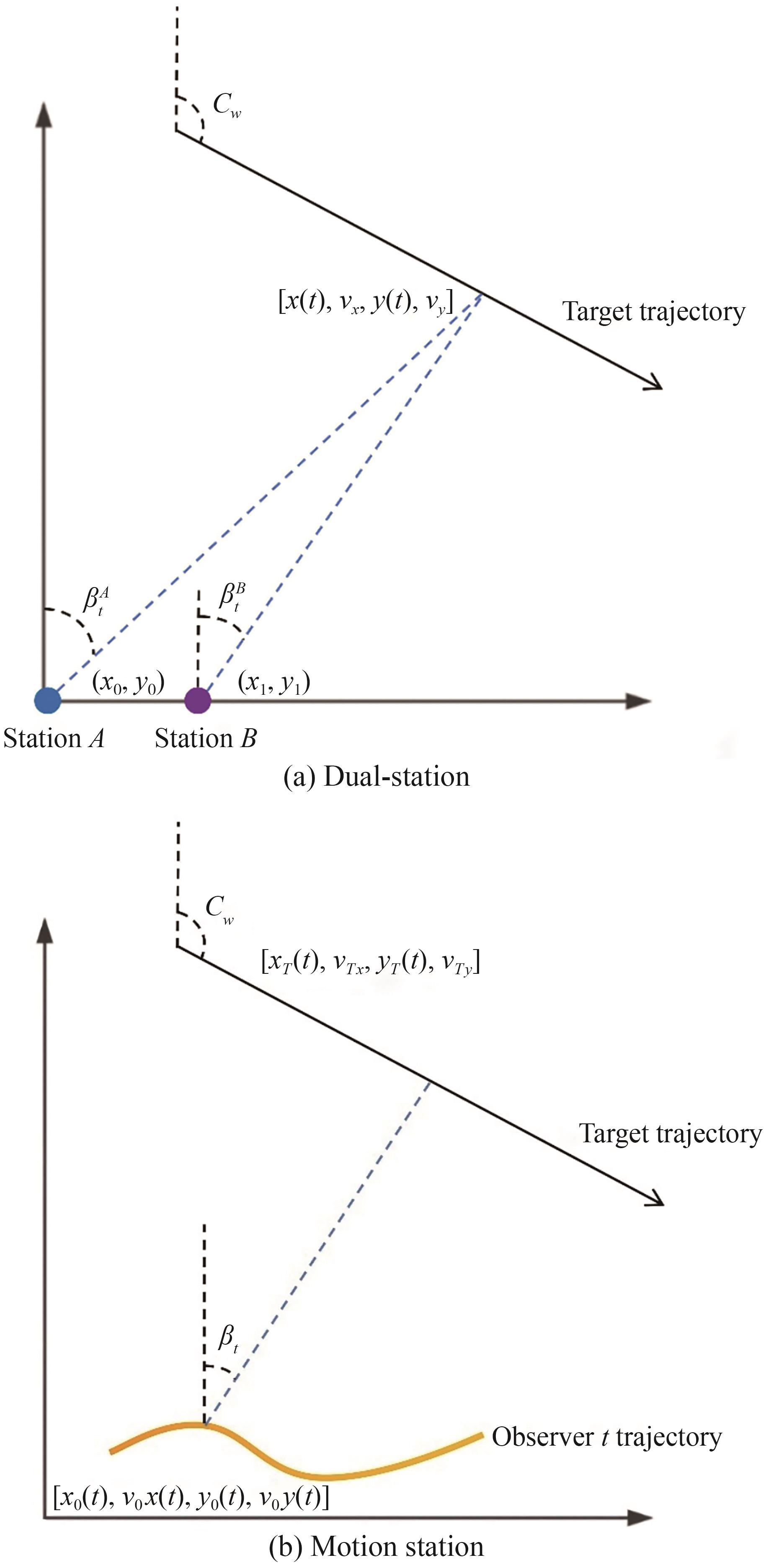 Figure 3(a) describes the positional relationship between the target and observation in the bearings-only bistatic tracking system, where observation station A is located at (x0, y0), and observation station B is located at (x1, y1). Figure 3(b) displays the relationship between the observation station and the target in the single-motion observation station system. The heading of the observation station is the angle between the north and the motion direction of the observation platform, which is calculated clockwise. According to Figure 2, the nonlinear representation of this system can be formulated as