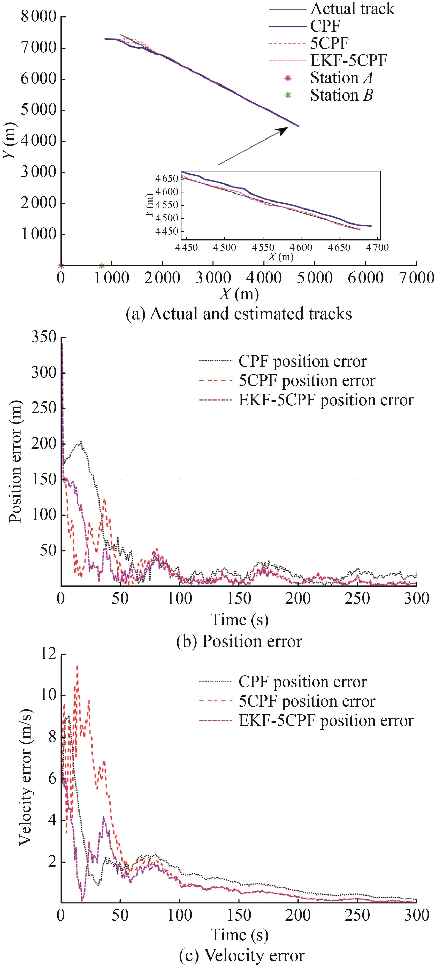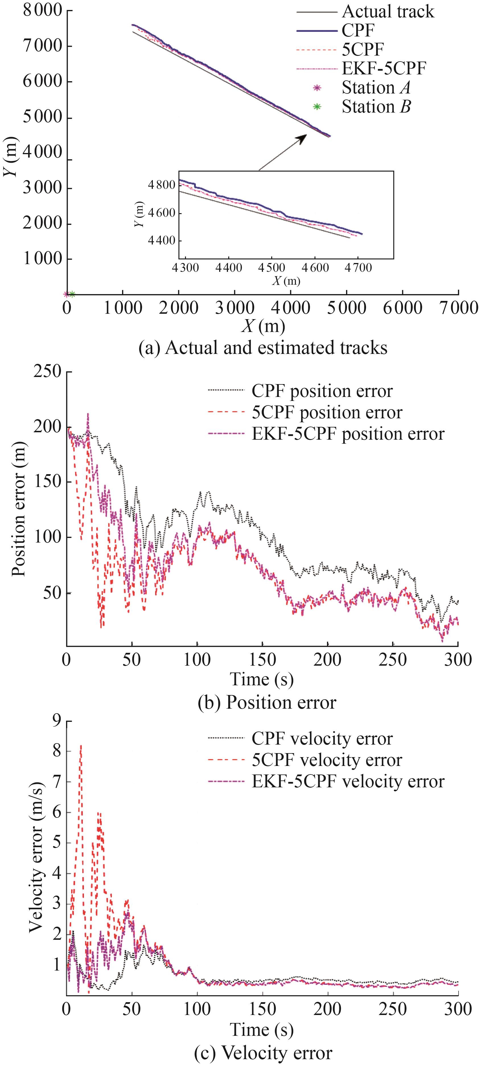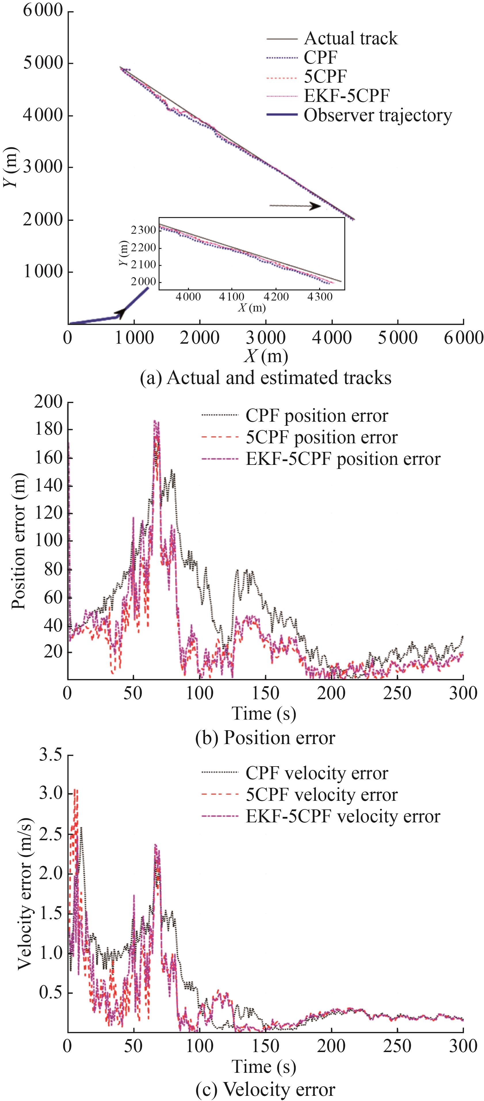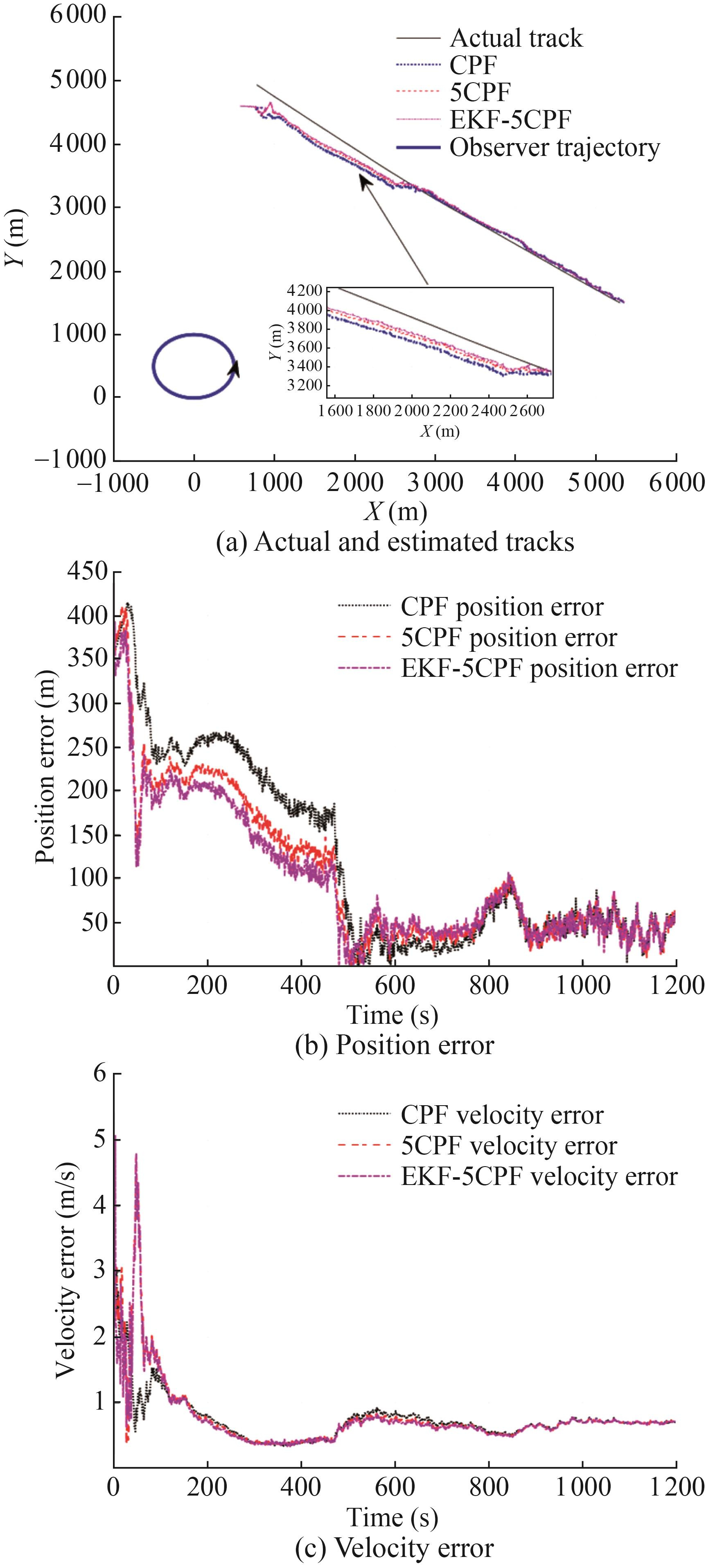 In practical military applications, when the speeds of the target and the observation station are close, it is essential to prolong the tracking time and increase the angle change of the observation station itself to improve the tracking accuracy. Therefore, this study simulates the tracking results of the three algorithms when the observation station is doing a circular motion with a radius of 500 m and a speed of about 5 m/s when T=1 200 s (Figure 9). Figure 9(b) describes the estimated position RMSE of the filter. Obviously, the 5CPF algorithm and the EKF-5CPF algorithm have faster convergence speeds and higher convergence accuracies than the CPF algorithm. Notably, when t=0-480 s, the position error of 5CPF and EKF-5CPF is about 100 m lower than that of CPF.