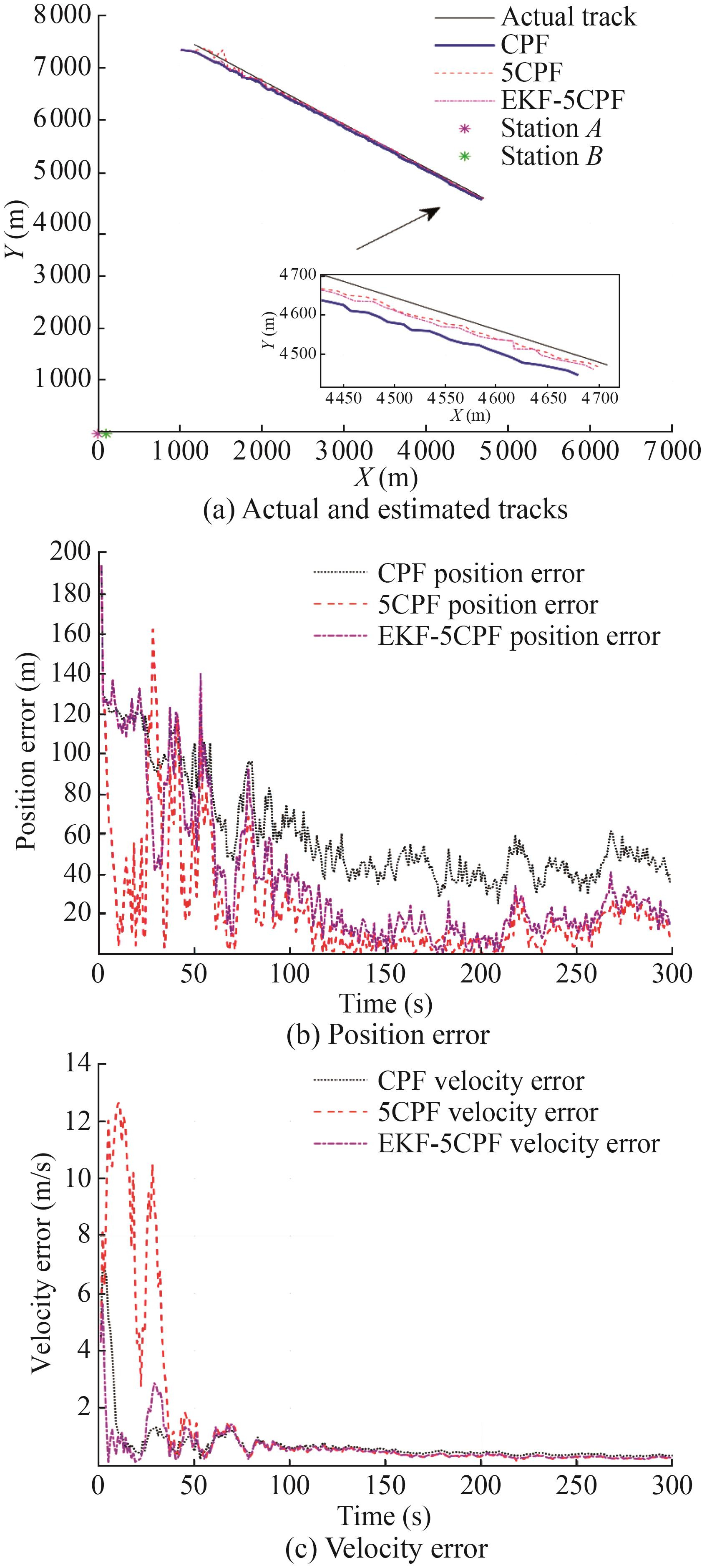 In this paper, we simulate CPF, 5CPF, and EKF-5CPF under different noise environments. The initial distance estimation of the experiment is randomly generated by the Gaussian normal distribution N(d0, 200), where d0 represents the true initial distance between the target and station A. We conduct 100 Monte Carlo experiments for each filtering method to analyze the filter performance over the time interval T=0-300 s.