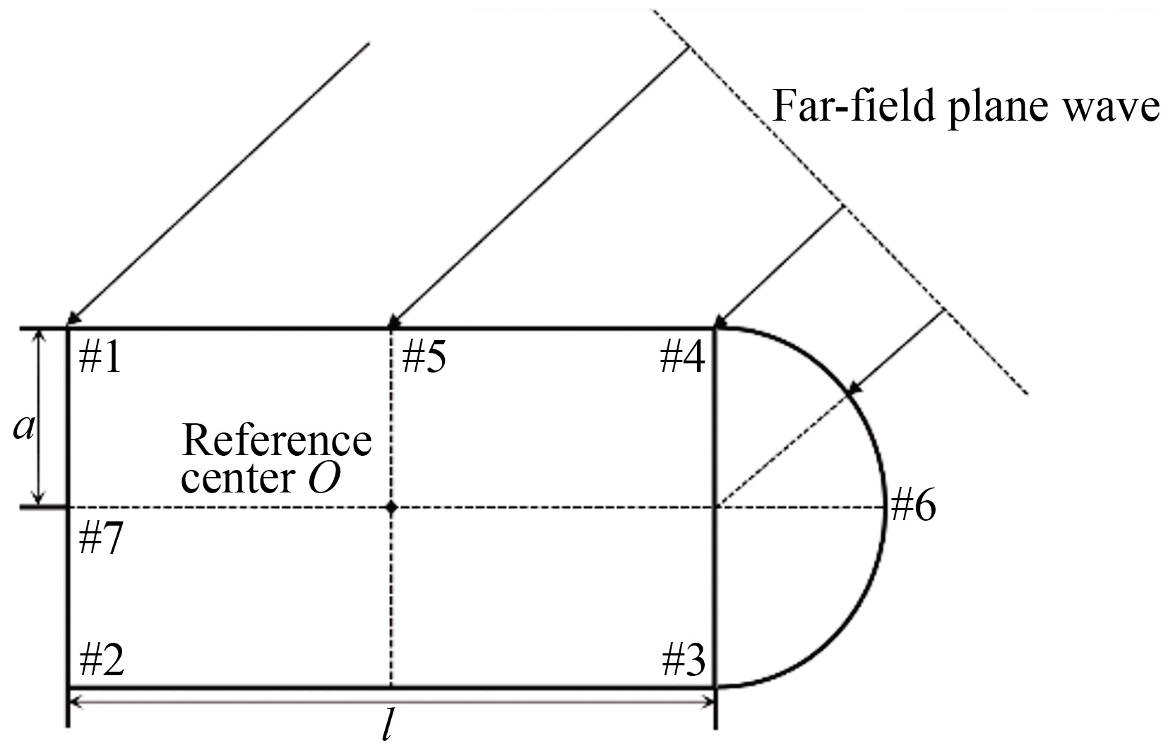 The experimental target model comprises seven geometric scattering centers, with the labels and specific positions of each scattering center shown in Figure 1. The target body is a cylindrical shell with a hollow interior. Scattering centers #1, #2, #3, and #4 are associated with angular reflection, while scattering center #5 is associated with mirror reflection. Scattering center #6 corresponds to hemispherical scattering and is located at the intersection point between the hemisphere and the line passing through the center of the hemisphere. Scattering center #7 is a planar scatterer, located at the center of the bottom of the model. The incident sound field is a plane wave; thus, the incident angle of the sound wave for all scattering centers is θ. Based on the properties of geometric bright spots mentioned earlier, the main observable scattering centers in the target echo follow the transformation rules with respect to the incident angle θ as outlined below.
