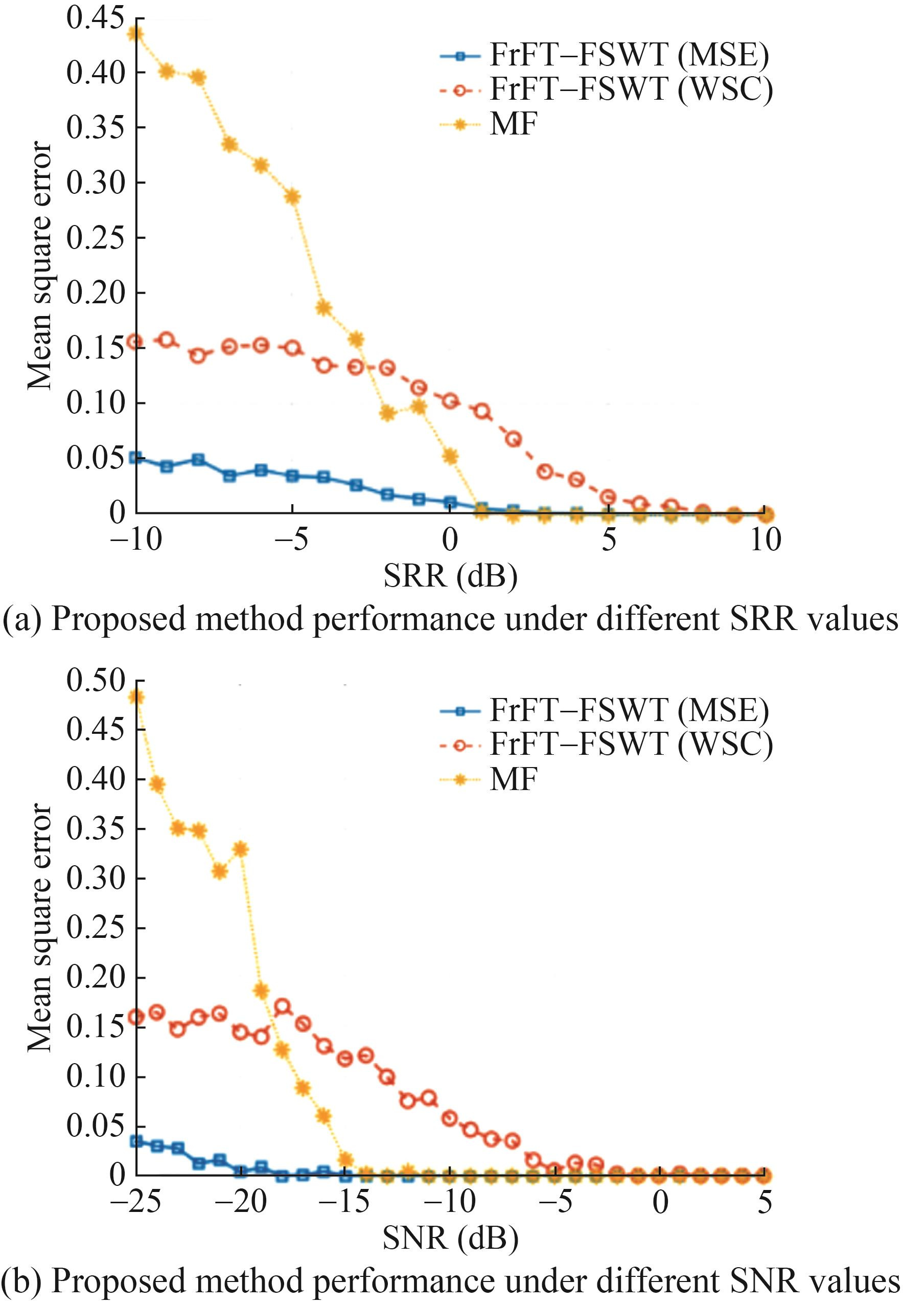 As shown in Figure 10, the "blue squares" indicate the delay estimation performance of the FrFT–FSWT joint time–frequency analysis method using mean square error as the evaluation parameter. The "red circles" indicate the performance of the same method evaluated by the waveform similarity coefficient. The "yellow asterisks" denote the delay estimation performance of the MF method. The "red circle" represents the delay estimation performance of the joint FrFT–FSWT time–frequency analysis method using the waveform similarity coefficient as the evaluation parameter, while the "yellow asterisk" denotes the performance of the MF method. As shown in Figure 10(a), the performance of MF deteriorates substantially when the SRR falls below -3 dB. Under an SRR = -10 dB, the relative error of the joint FrFT–FSWT algorithm is reduced by 66.7%–88.9% compared to MF. Similarly, Figure 10(b) shows that MF performance deteriorates when the SNR drops below -19 dB. At an SNR = -25 dB, the FrFT–FSWT joint algorithm achieves a 65.9%–91.5% lower relative error than MF. These results indicate that the delay estimation performance of MF deteriorates substantially under lower SRR/SNR conditions, whereas the FrFT–FSWT algorithm, particularly when evaluated using the mean square error, exhibits more stable and robust performance.