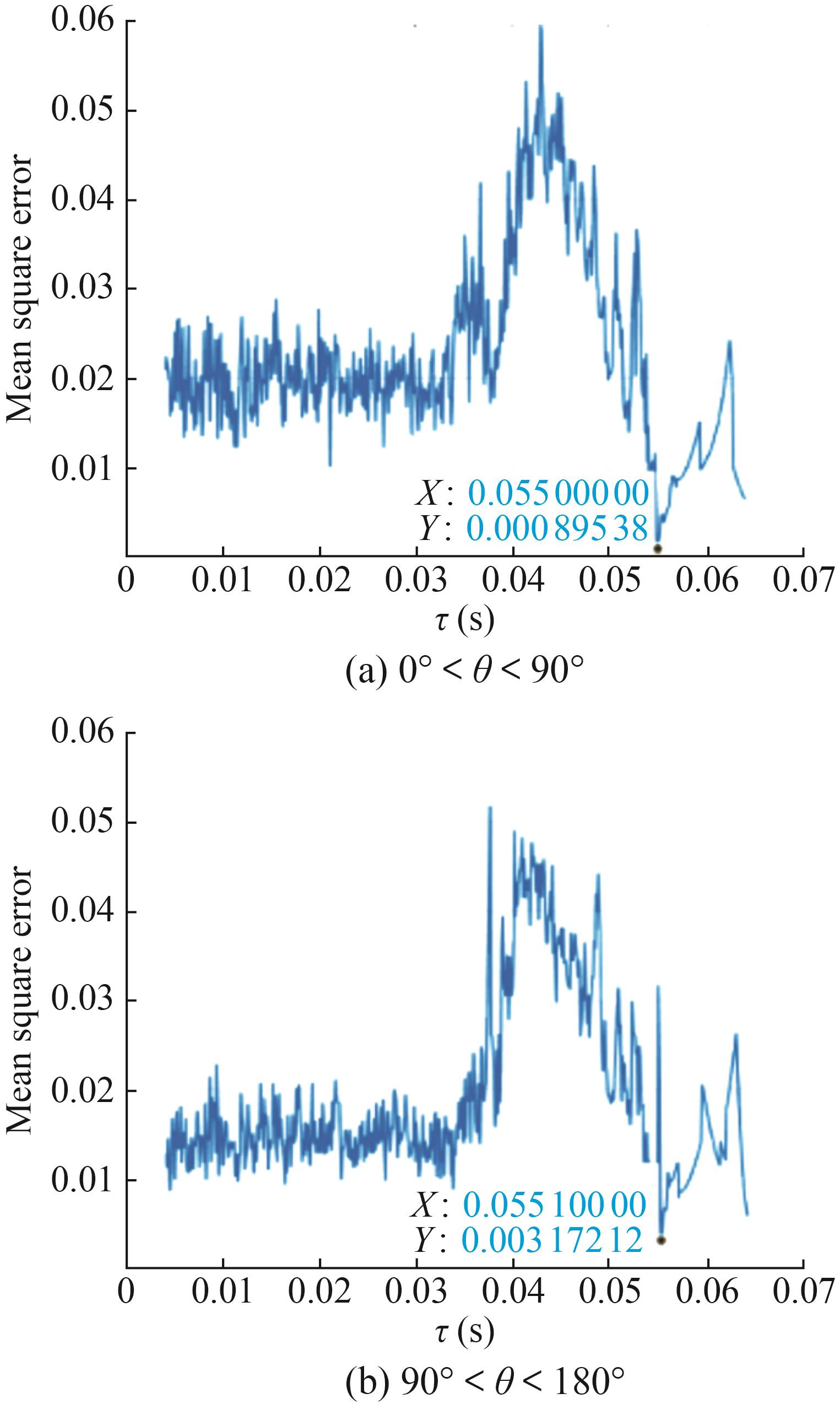 As shown in Figure 12, the reverberation in the experimental data is strong, and the time frame in which the signal appears cannot be clearly observed. As shown in Figure 13, the delay value estimated by the MF is approximately 0.002 3 s. The delay estimation result using the FrFT–FSWT is shown in Figure 14, where the mean square error curve indicates that τe occurs at 0.055 s, with the acoustic incidence angle ranging between 0° and 90°. As shown in Figure 15, the highest point of the curve of the waveform τρ similarity coefficient also occurs at 0.055 s. Compared with the real delay value of 0.056 6 s, the relative error is 2.83%. As shown in Figure 14, the mean square error remains low until approximately 0.04 s, and in Figure 15, the waveform similarity coefficient remains high until 0.04 s. This finding indicates that the reverberation is strong before 0.04 s. Therefore, under strong reverberation conditions, the MF estimate corresponds to the time when the reverberation first appears. Based on the time-delay estimation result τestimate=0.055 s from the FrFT–FSWT, the acoustic wave incidence angle is calculated to be approximately equal to 4.2°. The hemispherical head side of the underwater target is facing the sonar, and the straight-line distance from the sonar to the target is approximately 41.25 m. The relative position is shown in Figure 8(a).