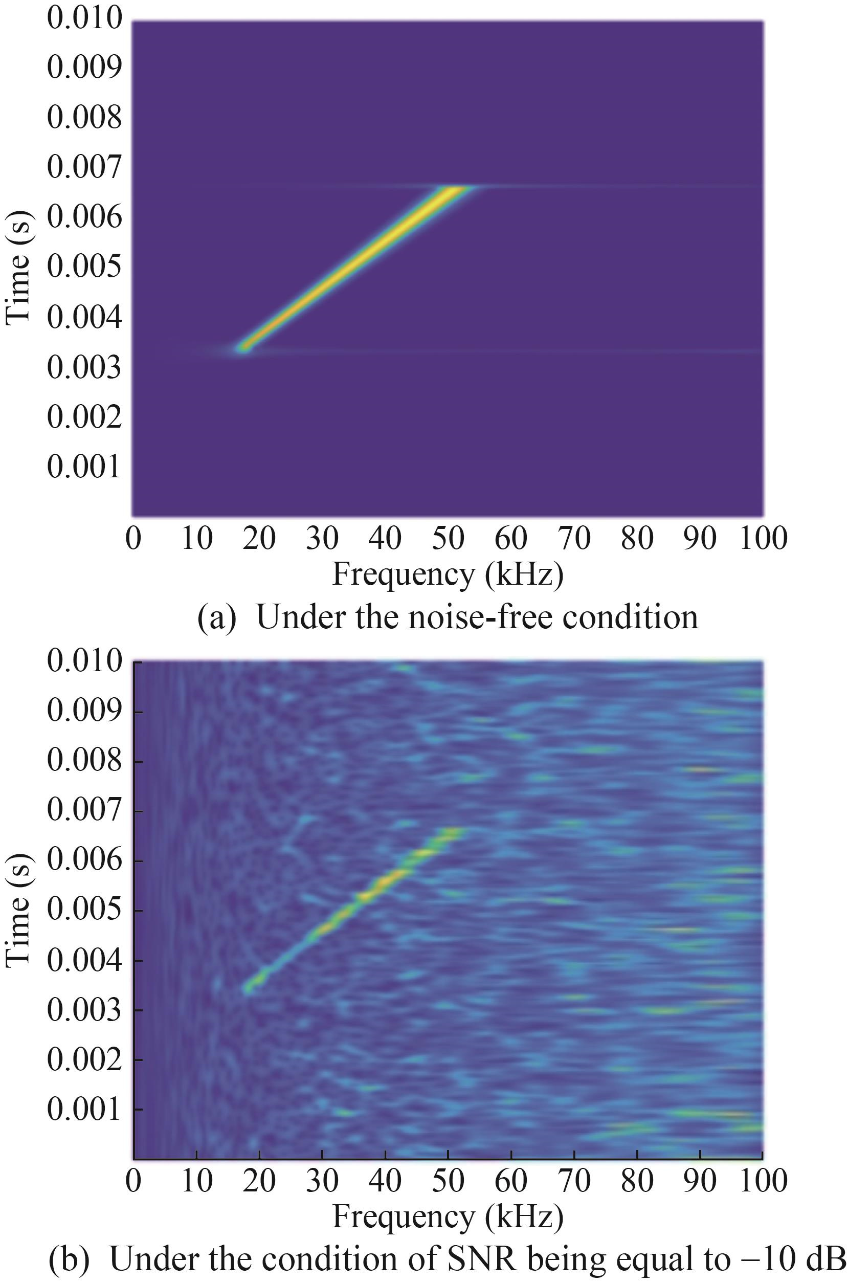 $$ K_{p}(t, u)= \begin{cases}\delta(t+u), & \alpha=2(n+1) \pi \\ \sqrt{\frac{1-\mathrm{i} \cot \alpha}{2 \pi}} \mathrm{e}^{\frac{t^{2}+u^{2}}{2} \cot u-\mathrm{i} u \csc \alpha}, & \alpha \neq n \pi \\ \delta(t-u), & \alpha=2 n \pi\end{cases} $$ (12) Based on Eqs. (12) and (9), FrFT is a linear transformation. Its linearity indicates that the FrFt of the echo is equal to the sum of the FrFts of each component, simplifying the analysis of the target echo and reverberation. Additionally, p is based on a period of 4; thus, only the case − 2≤p≤2 needs to be considered in practical applications. When p=1, FrFT corresponds to the traditional Fourier transform.