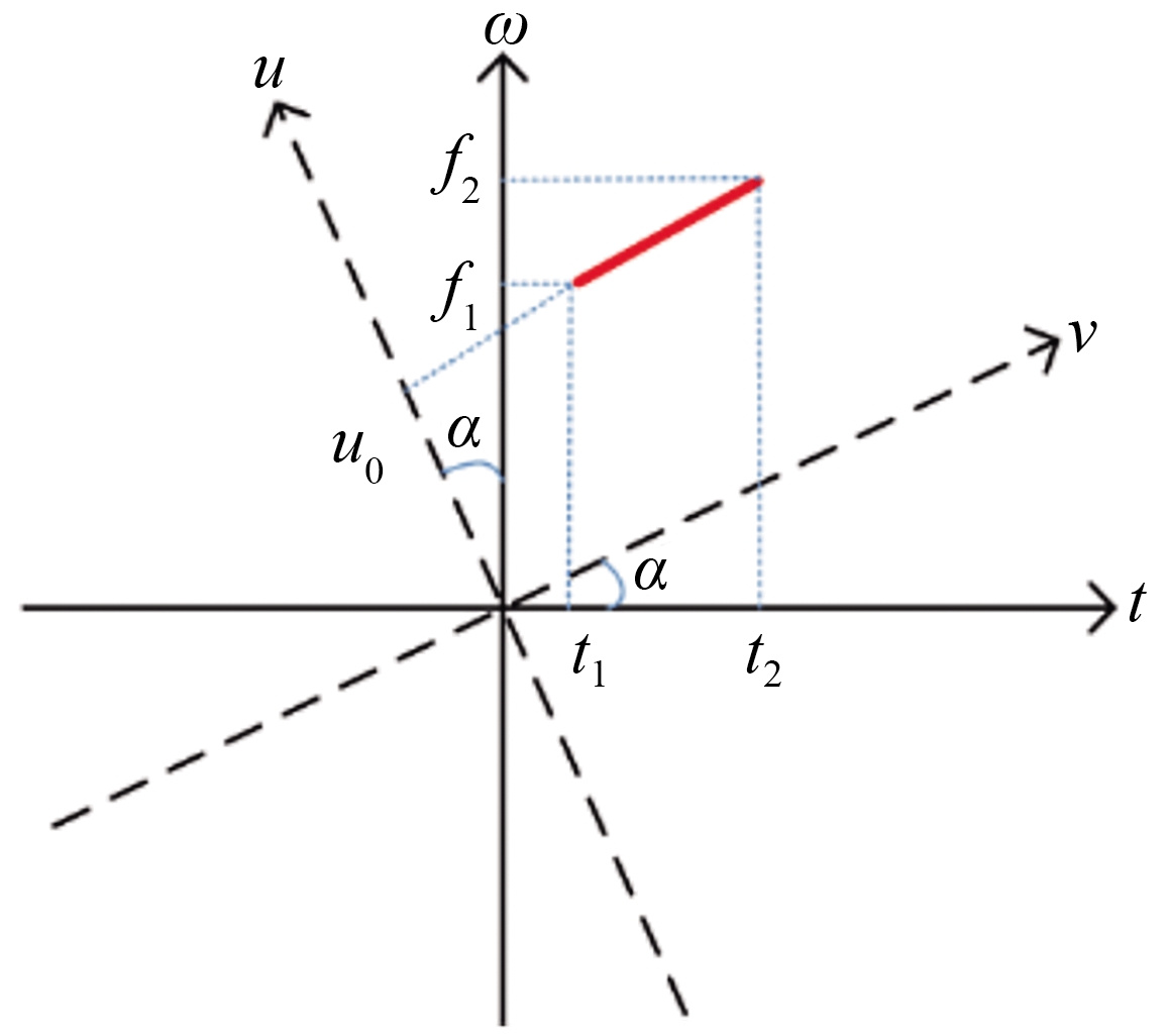 From the perspective of the time–frequency plane, FrFT denotes the result of rotating the time–frequency plane by an angle of α with the origin as the center. This rotation maps the signal into a new domain, known as the u-domain. As shown in Figure 5, the LFM signal is distributed along a straight line in the time–frequency plane, where its projection on the time axis t corresponds to the pulse width T of the signal, and its projection on the frequency axis ω represents the bandwidth B of the signal. The expression of the LFM signal in the time domain is given by the following: x(t)=exp(i2πf0t+iπkt2), t∈[0, T], where f0 is the signal center frequency and k is the frequency modulation slope. x(t) is substituted into Eq. (9) to obtain the p-order FrFT mathematical expression of the LFM pulse, as shown in Eq. (14).