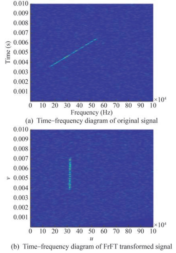 1) The target echo signal is first subjected to the FrFT to obtain the domain signal. The FrFT preserves the total energy of the signal but alters its energy distribution. Thus, the FrFT process helps suppress some of the reverberation and noise.