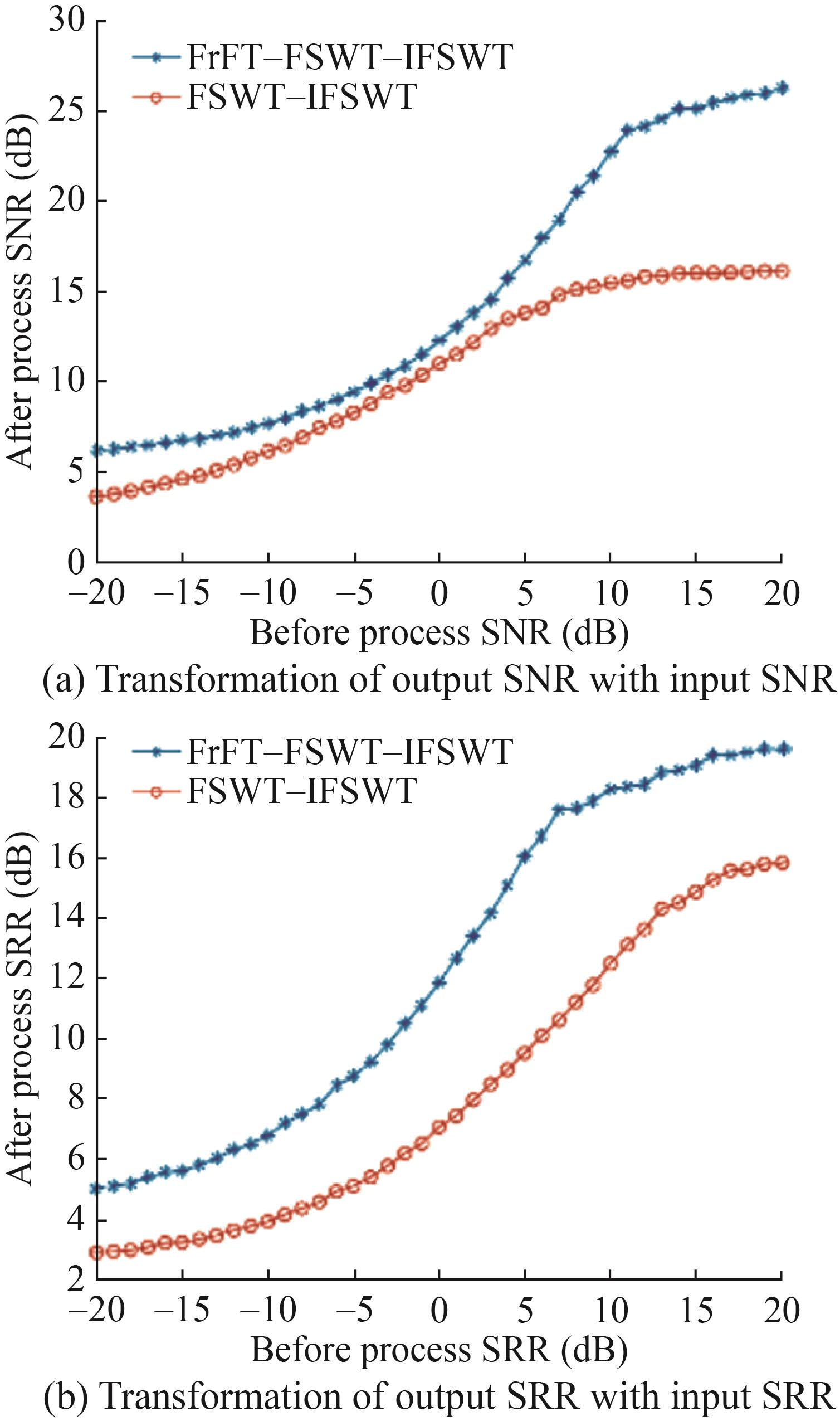 As shown in Figure 6, due to differences in time–frequency concentration between noise, reverberation, and the LFM signal in the u-domain, the total energy of the signal remains unchanged before and after the FrFT. However, the distribution of this energy is altered. As described in Section 3.1, applying the FSWT–IFSWT to a signal is equivalent to its passage through a bandpass filter within a specific frequency band. Meanwhile, FrFT concentrates the signal’s energy at a specific frequency point. Based on the conditional distribution characteristics of reverberation and noise, combining FrFT with FSWT–IFSWT enables highly effective suppression of reverberation and noise. For xu(t), FSWT and IFSWT are applied sequentially, and the SNR and SRR of the processed signal are calculated. The results are shown in Figure 7.