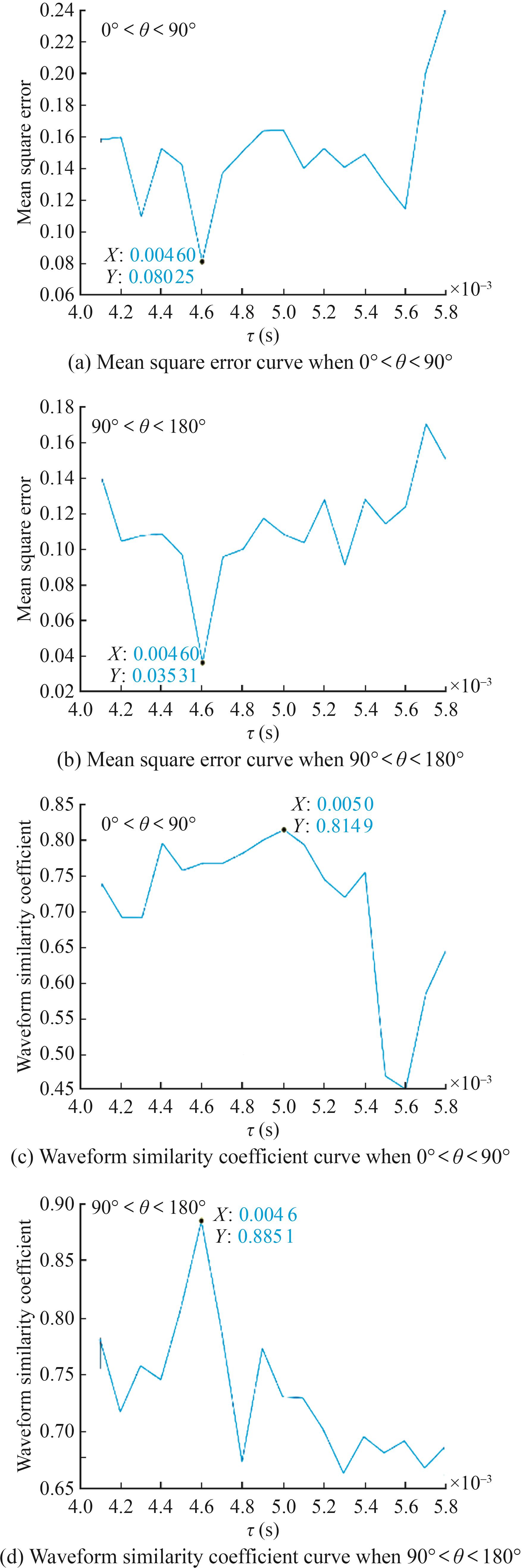 When the angle of acoustic incidence is within 0° < θ < 90°, the observation results of Wi_0_90(v, u, τi) are shown in Figures 9(a) and (c). The lowest point of the mean square error curve is located at τe=0.004 6 s, with a corresponding error value of eMSE_0.004 6≈0.09. Meanwhile, the highest point of the waveform similarity coefficient is located at τρ=0.005 s, with a corresponding waveform similarity coefficient ρWSC_0.005≈0.09. τρ and τe are not the same; therefore, the angle of acoustic incidence is not within 0° < θ < 90°. When the angle of acoustic incidence is within 90° < θ < 180°, the observation results of Wi_90_180(v, u, τi) at this time, as shown in Figures 9(b) and (d). The lowest point of the mean square error is located at τe=0.004 6 s, corresponding to eMSE_0.004 6≈0.09, while the highest point of the waveform similarity coefficient is located at τρ=0.004 6 s, corresponding to ρWSC_0.046≈0.85. τe and τρ are consistent. Furthermore, eMSEeMSE is smaller than that at 0° < θ < 90°, and ρWSE is larger than that at 0° < θ < 90°, indicating that the acoustic wave incidence angularity is within 90° < θ < 180°. Therefore, the time for the target echo to arrive at the receiving end of the active sonar is approximately 0.004 6 s0.004 6 s.