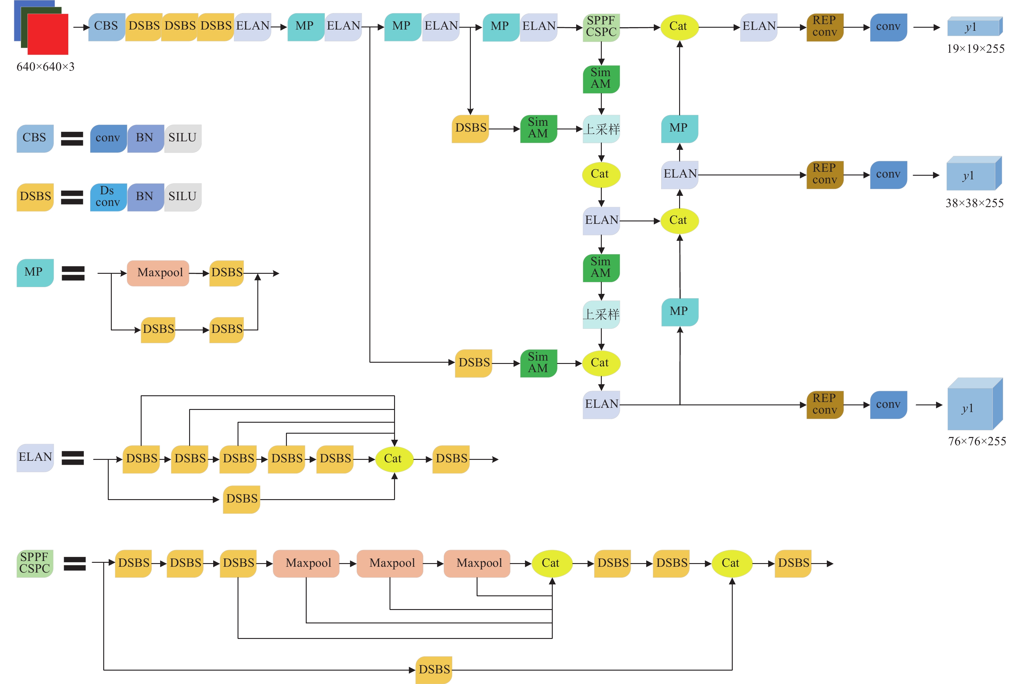 网络使用固定大小的图片训练, 用深度可分离卷积替换了常规卷积, 用SPPFCSPC替换SPPCSPC, 加入了SimAM注意力模块, 具体的网络结构如图1所示.