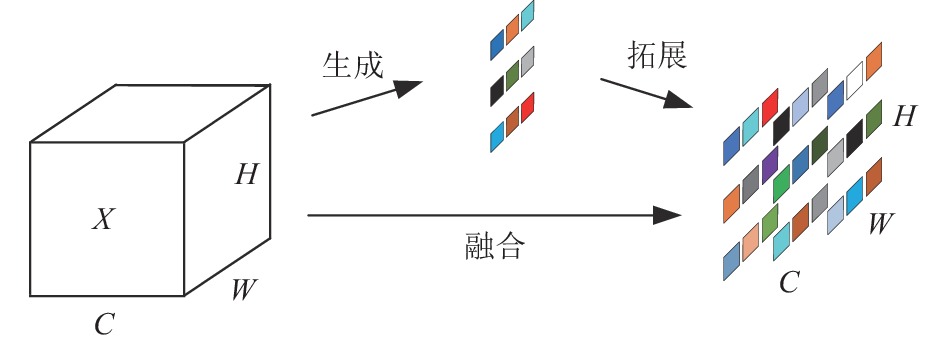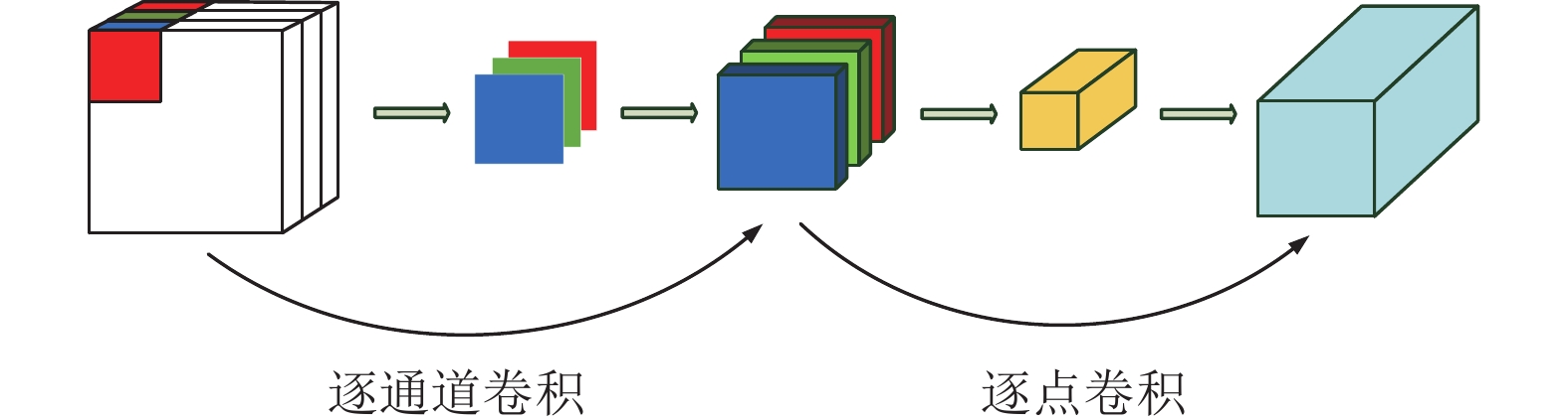 深度可分离卷积主要分为两个过程: 逐通道卷积和逐点卷积. 在逐通道卷积中, 一个卷积核负责一个通道, 一个通道只被一个卷积核进行卷积, 经过逐通道卷积产生的特征图数量和输入图片的通道数保持一致. 逐点卷积与常规卷积基本类似, 它的卷积核大小为1×1×M (M为上一层的通道数), 相当于是将输入在深度方向进行加权相加, 生成新的特征图, 其中特征图的数量由卷积核的数量决定. 深度可分离卷积的示意图如图2所示.