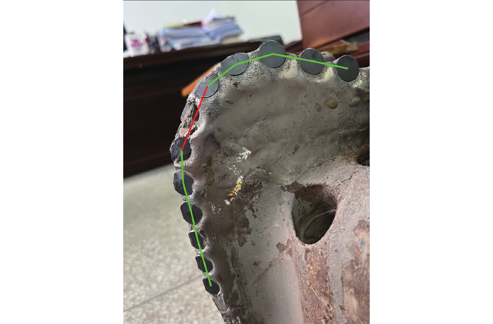 (7)若某两个点之间的距离超过平均值一定范围(根据钻头类型选取范围区间), 则判断此处存在缺损情况, 用红色线段表示.