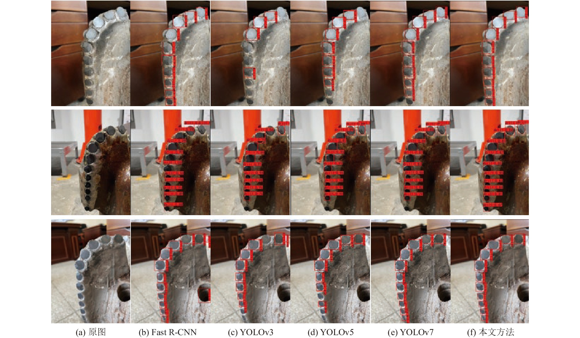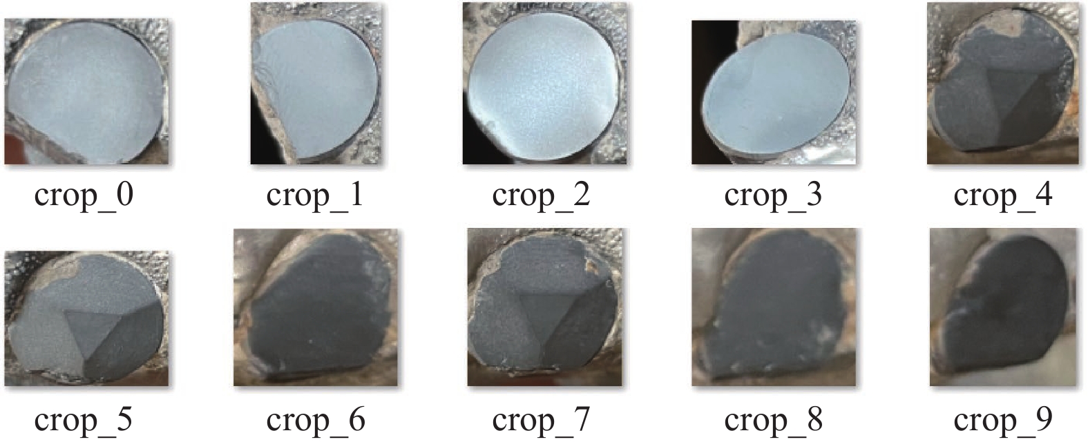 2.1 数据集实验的数据集来自生产现场的PDC钻头, 为了解决数据集过小的问题, 增强模型的泛化能力, 于是对数据集进行了扩充. 本文采用亮度增强, 对比度增强、水平翻转、随机旋转、随机裁剪、添加噪声、颜色空间变换、图像模糊8种扩充方式, 扩充后共计1800张图像, 部分PDC钻头数据集扩充结果如图7所示.