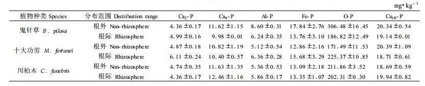 与根外土壤相比,鬼针草根际的Ca2-P含量高于根外土壤,其他形态的无机磷则相反;川柏木根际的Ca2-P、O-P低于根外土壤,其他形态无机磷的分布格局为内高外低;十大功劳根际的Ca2-P、O-P、Fe-P、Al-P含量高于根外,Ca 8-P和Ca10-P则较根外低(表 1)。