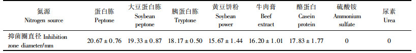 以2%蔗糖为碳源,在发酵培养基中分别加入2%的不同氮源,进行发酵,结果见表 4.由表 4可知,该菌株对有机氮源的利用普遍好于无机氮源,其中以蛋白胨效果最佳.