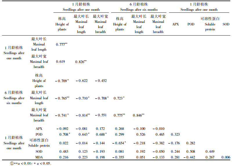 通过对航天搭载大青杨苗木以及地面对照苗木的生物量及抗氧化酶生化指标数据的相关性分析,由表 1可知,本研究中所测数据部分之间达到显著或者极显著的相关关系。其中,1月龄植株的株高与最大叶长、6月龄植株的株高、最大叶长及最大叶宽间均达到显著或者极显著的正相关关系,说明1项指标会随着另1项指标的增加而变大。而1月龄的株高、最大叶长与6月龄的3项生物量指标间呈显著或极显著的负相关关系,其原因可能是在扦插1个月时,植株受空间环境的影响较大,与地面对照相比生长较为迅速;而6个月时这种优势不再明显,3项生物量指标略低于同一时间的地面对照,因此,可能导致1月龄大青杨幼苗与6月龄幼苗呈负相关关系。在抗氧化指标中,POD与1月龄大青杨3项生物量指标呈显著的正相关关系,这有利于防御活性氧对细胞膜系统的伤害。