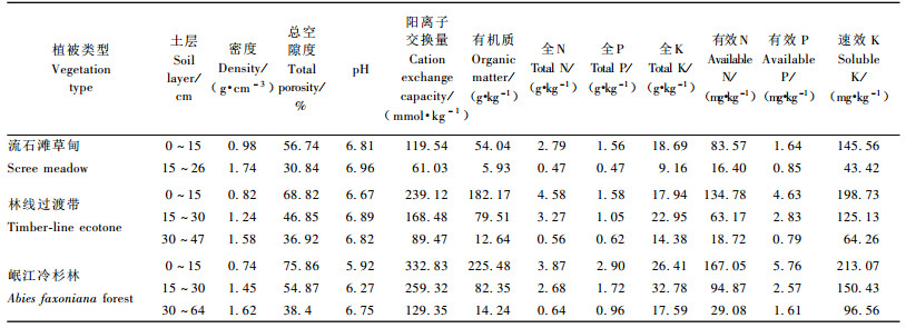 1 研究区概况王朗自然保护区(103°55′—104°10′ E,32°49′—33°02′ N),海拔2 300~4 980 m,位于四川省平武县内,地处青藏高原与四川盆地的过渡地带,属于丹巴-松潘半湿润气候。研究样地设于保护区大窝凼外侧坡林线交错带(104°01′E, 32°59′N), 海拔3 300 m。年均气温1.0 ℃,1月气温-6.6 ℃,7月气温8.9 ℃,年相对湿度70.0%,年降水量859 mm。流石滩草甸主要以莎草(Cyerus sp.)、苔草(Carex kansuensis)和羊茅(Leymus ovina)为主,盖度约16%。在整个林线交错带,混生少量乔木,乔木以岷江冷杉(Abies faxoniana)和糙皮桦(Betula utilis)为主; 灌木层主要有高山绣线菊(Spiraea alpina)、杜鹃(Rhododendron spp.)、高山柳(Salix paraplesia)、刚毛忍冬(Lonicera hispida)、花楸(Sorbus sp.)和蔷薇(Rosa sp.),盖度达70%以上; 草本层以莎草和苔草为主,盖度约27%。下缘冷杉林乔木层主要为岷江冷杉,密度为182株·hm-2,树高18 m,胸径24 cm,郁闭度0.56,地被层苔藓盖度达90%以上。林线交错带及邻近植被土壤特性见表 1。