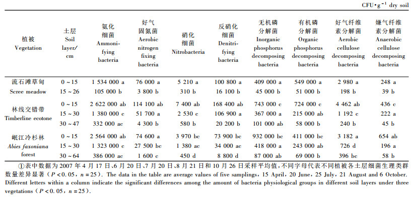 对林线交错带及邻近植被土壤细菌生理类群垂直空间分布研究表明,0~15 cm表层土壤是细菌生理类群分布最多、活动较旺盛的土层,并随土层加深,各细菌生理类群数量逐渐降低。这是因为植物根系多分布在上层土壤,根系分泌物和脱落物是微生物生长的重要营养源,加之水热状况较好,因此表层土壤是微生物活动最为活跃的区域(张崇邦等, 2002; Fierer et al., 2003)。另外研究表明,氨化细菌、有机和无机磷分解菌是林线交错带及邻近植被土壤中最主要的优势菌群,而好气与厌气纤维素分解菌数量最低(表 2), 表明各植被具有较为活跃的土壤有效N和P的转化。但由于林线附近高海拔极端的低温和气候条件,好气与厌气纤维素分解菌数量较低,有机质分解缓慢,微生物生长必需的碳源和能源物质缺乏,各菌群数量均低于同地区低海拔(2 600 m)的冷杉针叶林(王开运, 2004)。另外,各菌群数量与土壤物理构成, 有机质、N和P等养分含量关系密切(表 3)。基于残积母质上发育而成的林线交错带及林缘植被土壤浅薄,土壤质地粗骨化,有机质及养分含量较低(表 1),也是细菌生理类群数量低于低海拔冷杉针叶林的原因。