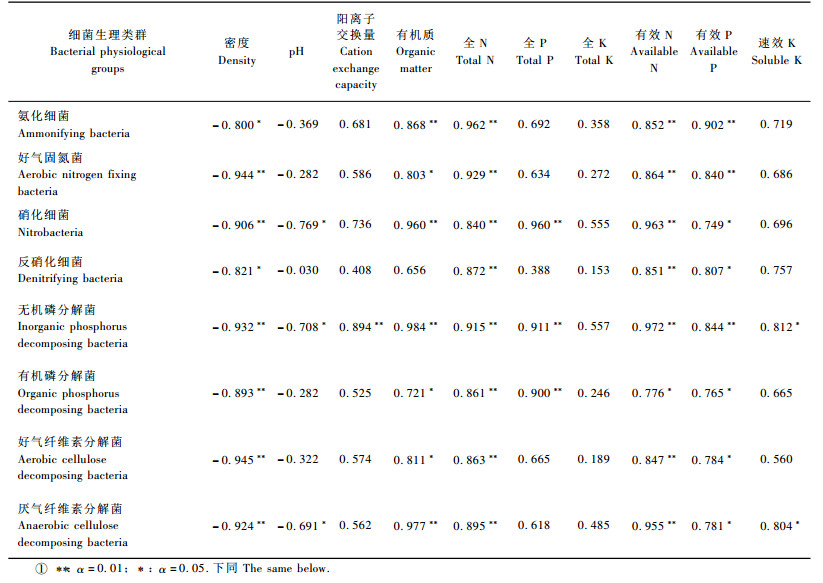 由表 3可知,林线交错带及邻近植被土壤中,氨化细菌、好气固氮菌数量主要受土壤有机质、全N、有效N、有效P含量及土壤密度的影响,硝化细菌数量除受上述化学参数影响外,还受土壤pH值及全P含量的影响。反硝化细菌数量与全N、有效N、有效P含量及土壤密度相关。磷素转化细菌中无机磷分解菌与有机磷分解菌数量均受土壤有机质、全N、全P、有效N、有效P含量及土壤密度的影响,除此之外,无机磷分解菌还受土壤pH值、阳离子交换量及速效K含量的影响。碳素转化细菌中好气与厌气纤维素分解菌数量均与有机质、全N、有效N、有效P和土壤密度相关,厌气纤维素分解菌还受土壤pH值和速效K含量的影响。以上研究结果也表明了可利用的C源、N源和P源是土壤微生物生长的重要限制因素。