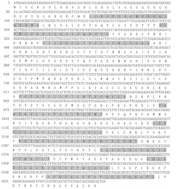 图 1 BoSUT2编码区核酸序列及其推导出的氨基酸序列(阴影部分为跨膜区) Figure 1 Nucleotide and predicted amino acid sequence of BoSUT2 (transmembrane regions in shadow) |