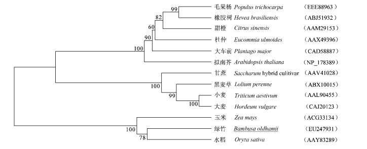 应用在线软件(http://blast.ncbi.nlm.nih.gov/Blast)比较结果显示,BoSUT2与单子叶植物的蔗糖转运蛋白的氨基酸序列都有较高的一致性,如与水稻、玉米、甘蔗(Saccharum hybrid cultivar)、小麦、大麦(Hordeum vulgare)、黑麦草(Lolium perenne)的SUT编码的氨基酸序列的一致性分别达到74.0%, 71.9%, 53.6%, 52.0%, 51.0%和51.1%。与双子叶植物的蔗糖转运蛋白基因的一致性要稍低一些,如与拟南芥的SUT2的一致性仅为45.1%。与绿竹中已分离的BoSUT1的一致性为92.3%,这说明分离的BoSUT2基因是绿竹蔗糖转运蛋白基因家族的1个新成员。应用MEGA4软件进行系统进化树分析,结果显示绿竹与水稻、玉米等单子叶植物位于较近的分支点上,而双子叶植物拟南芥等则在另一个分支上(图 2), 这与形态学分类相吻合。