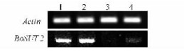 以绿竹Actin基因作内标(李雪平等,2007),调整cDNA用量和循环数,使内标基因的表达丰度一致。以调整后的cDNA模板量进行BoSUT2基因的扩增。结果(图 4)表明,BoSUT2基因在叶片、叶鞘和根中均有表达,其中在叶片和叶鞘中的表达丰度较高且比较接近,在根中有微弱表达,而幼茎中没有检测到表达。
