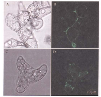 取烟草抗性悬浮细胞进行显微镜观察,结果表明,在488 nm激发光下观察,绿色荧光信号主要分布在细胞膜上(图 6 A, B), 而只转化GFP的对照BY-2细胞中,绿色荧光信号分布在整个细胞,没有特异性(图 6 C, D)。由此证明BoSUT2:GFP融合蛋白位于烟草悬浮细胞中的细胞膜上,进一步证实BoSUT2基因编码膜蛋白。