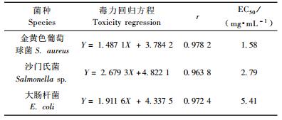 2) 中性亲脂性成分的EC50测定结果 蚬壳花椒中性亲脂性成分对细菌的毒力测定结果见表 1。结果表明,测试样品对金黄色葡萄球菌抑制作用较强,EC50为1.58 mg·mL-1;其次为沙门氏菌,EC50为2.79 mg·mL-1;对大肠杆菌的抑制作用较弱,EC50为5.41 mg·mL-1。此外,从毒力回归方程和相关系数r值可以看出,中性亲脂性成分对细菌的抑菌活性和浓度呈正相关,即蚬壳花椒中性亲脂性成分对细菌的毒力随着浓度的增高而增强。
