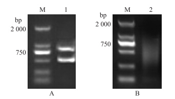 | 图 1 不结球白菜Pol胞质雄性不育系花总RNA(A)和mRNA(B)电泳图 Fig. 1 Electrophoresis of total RNA(A)and mRNA(B)of Pol CMS flowers in non-heading Chinese cabbage M:DL2000 marker;1:总RNA Total RNA;2:mRNA |