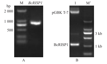 目的片段连接pMD18-T载体,EcoRⅠ和BamHⅠ双酶切pMD18-BcRISP1重组质粒和空载体pGBK T-7质粒,获得与PCR产物大小一致的酶切产物(图 3-A)。T4连接酶连接,获得插入pGBK T-7载体的诱饵载体pGBK T-7-BcRISP1,双酶切重组质粒获得与预期片段大小一致的条带(图 3-B)。