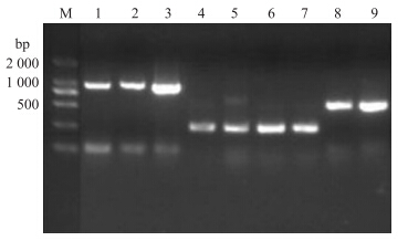 | 图 4 阳性克隆PCR鉴定电泳图 Fig. 4 Electrophoresis of positive clones M:DL2000 marker;1~9:互作蛋白PCR条带 PCR lines of interaction proteins |