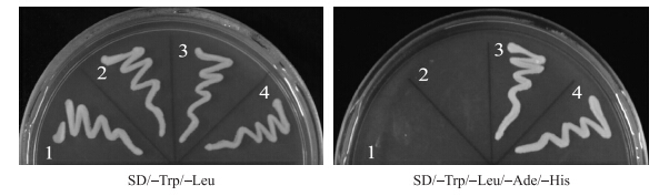 | 图 5 BcRISP1互作蛋白筛选 Fig. 5 Screening for interaction proteins of BcRISP1 1:pGAD+pGBK;2:pGAD+pGBK-BcRISP1;3:pGAD-CYP81G+pGBK-BcRISP1;4:pGAD-PIP2+pGBK-BcRISP1 |